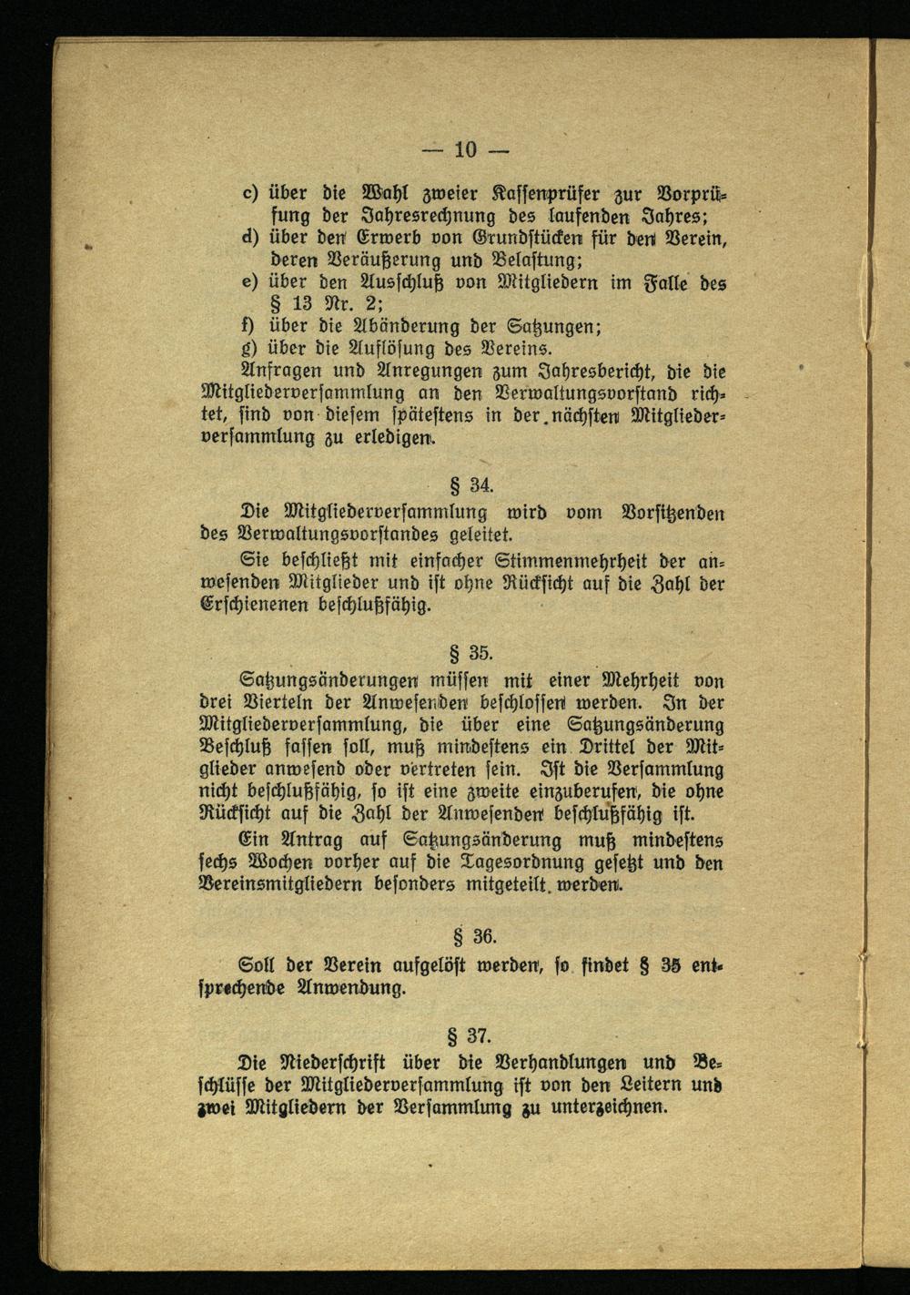 c) über die Wahl zweier Kassenprüfer zur Vorprüfung der Jahresrechnung des laufenden Jahres; d) über den Erwerb von Grundstücken für den Verein, deren Veräußerung und Belastung: e) über den Ausschluß von Mitgliedern im Falle des § 13 Nr. 2;