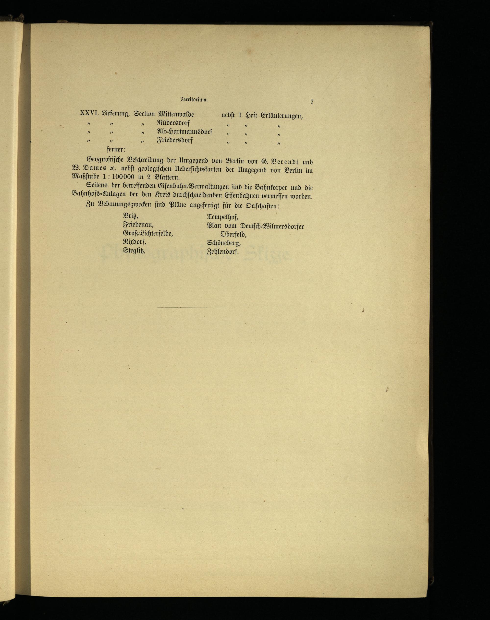 XXVI. Lieferung, Section Mittenwalde nebſt 1 Heft Erläuterungen, „ Rüdersdorf „Alt⸗Hartmannsdorf „Friedersdorf ferner: Geognoſtiſche Beſchreibung der Umgegend von Berlin von G. Berendt und W. Dames 20. nebſt geologiſchen Ueberſichtskarten der Umgegend von Berlin im Maßſtabe 1: 100000 in 2 Blättern. Seitens der betreffenden Eiſenbahn⸗Verwaltungen ſind die Bahnkörper und die Bahnhofs⸗Anlagen der den Kreis durchſchneidenden Eiſenbahnen vermeſſen worden. Zu Bebauungszwecken ſind Pläne angefertigt für die Ortſchaften: Britz , Tempelhof , Friedenau , Plan vom Deutſch⸗Wilmersdorfer Groß⸗Lichterfelde , Oberfeld, Rixdorf, Schöneberg , Steglitz, Zehlendorf.
