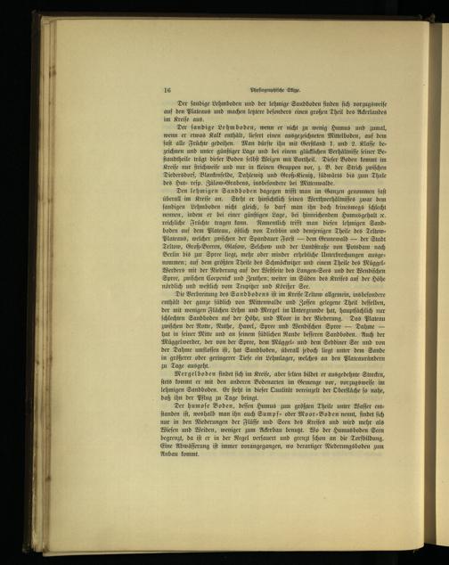 Den lehmigen Sandboden dagegen trifft man im Ganzen genommen faſt überall im Kreiſe an. Steht er hinſichtlich ſeines Werthverhältniſſes zwar dem ſandigen Lehmboden nicht gleich, ſo darf man ihn doch keineswegs ſchlecht nennen, indem er bei einer günſtigen Lage, bei hinreichendem Humusgehalt 2c. reichliche Früchte tragen kann. Namentlich trifft man dieſen lehmigen Sand— boden auf dem Plateau, öſtlich von Trebbin und demjenigen Theile des TeltowPlateaus, welcher zwiſchen der Spandauer Forſt— dem Grunewald — der Stadt Teltow, Groß⸗Beeren, Glaſow, Selchow und der Landſtraße von Potsdam nach Berlin bis zur Spree liegt, mehr oder minder erhebliche Unterbrechungen ausgenommen; auf dem größten Theile des Schmöckwitzer und einem Theile des MüggelWerders mit der Niederung auf der Weſtſeite des Langen⸗Sees und der Wendiſchen Spree, zwiſchen Coepenick und Zeuthen ; weiter im Süden des Kreiſes auf der Höhe nördlich und weſtlich vom Teupitzer und Körißer See.