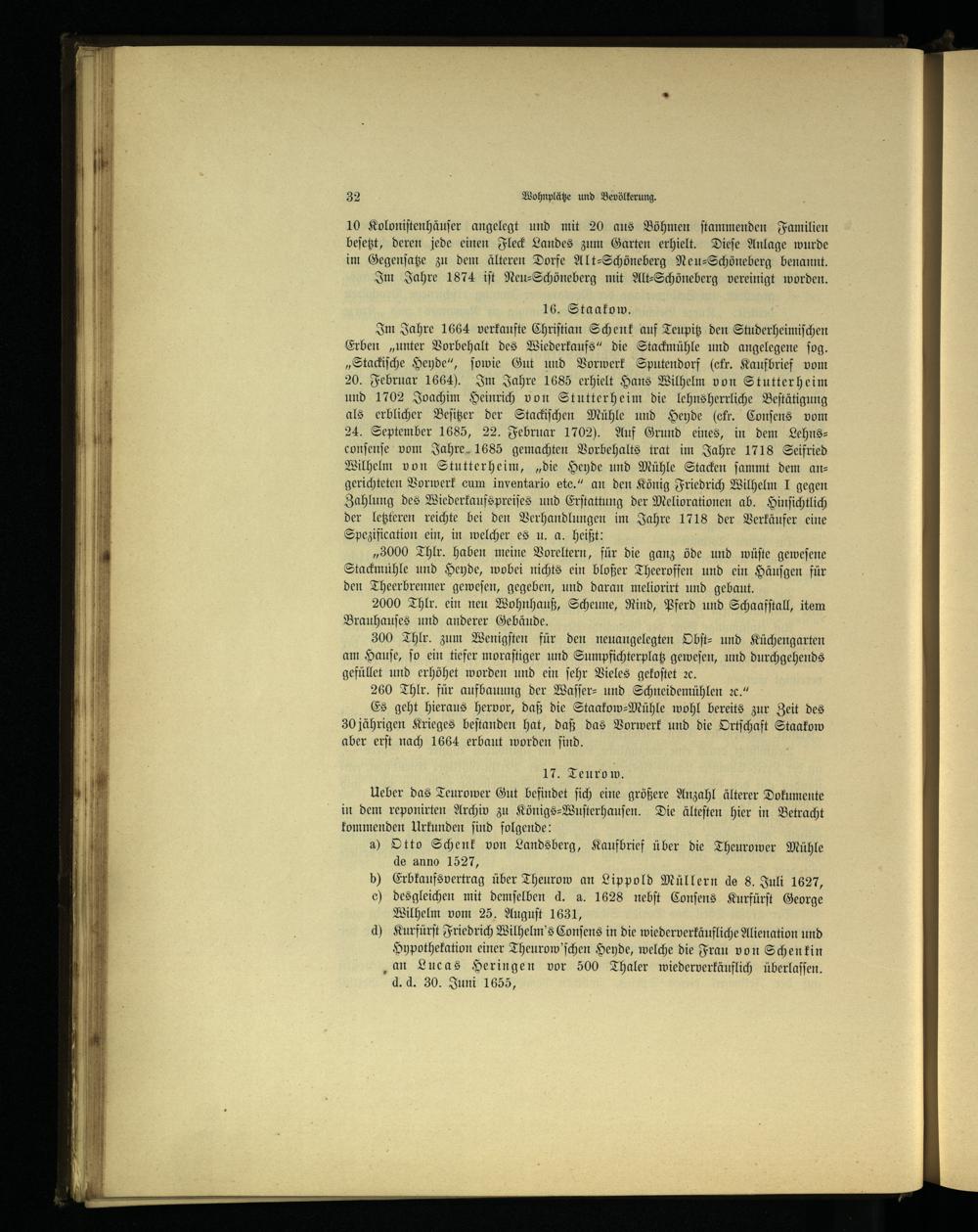 Es geht hieraus hervor, daß die Staakow-Mühle wohl bereits zur Zeit des 30 jährigen Krieges beſtanden hat, daß das Vorwerk und die Ortſchaft Staakow aber erſt nach 1664 erbaut worden ſind.