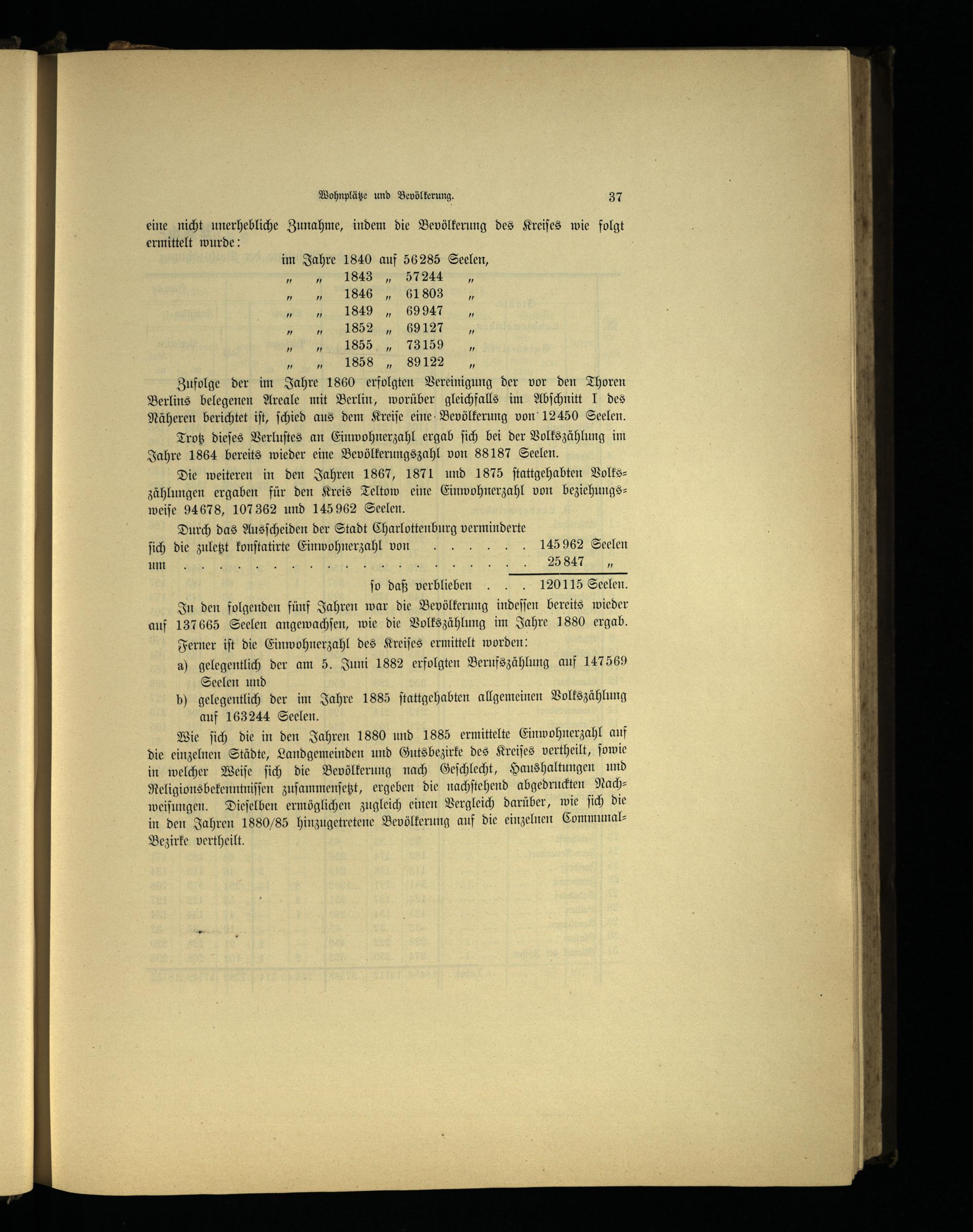 Zufolge der im Jahre 1860 erfolgten Vereinigung der vor den Thoren Berlins belegenen Areale mit Berlin , worüber gleichfalls im Abſchnitt I des Näheren berichtet iſt, ſchied aus dem Kreiſe eine Bevölkerung von 12450 Seelen.