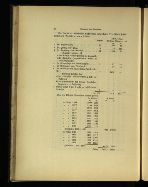 Anſtalten Pfleglinge, Zöglinge u. m. w. für Beherbergung 69 328 82 für Heilung und Pflege 8 143 215 für Erziehung und Unterricht 13 1255 90 — Hierunter befinden ſich: a) das Königl. Lehrer-Seminar zu Coepenick, h) die Königliche Haupt⸗Cadetten-Anſtalt zu Groß⸗Lichterfelde — für Armenpflege und Wohlthätigkeit 2 12 38 für Beſſerungs⸗ und Strafzwecke. 67 15 . für militäriſche und Kriegsmarine-Zwecke aller wd 8 K — Hierunter befinden ſich: a) die Königliche Militär⸗Schieß⸗Schule zu Ruhleben, b) die Kaſernements des Königl. EiſenbahnRegiments zu Schöneberg — ſonſtige unter 1 bis 6 nicht zu claſſificirende Anſtalten JJ 1. 16— Sa. 108 3314 390. Von den 137665 Einwohnern waren geboren: im Einzelnen im Ganzen m. w. m. w im Jahre 1880 2200 2249 . 168369 2150 2136 ö. nn 1878 2036 2061 .. 1959 2004 3.. 2002 1928 ö. u. 1875 1832 1805 . 1874 1607 1610 . 1875 1583 1550 J 1468 1501 . J 1080 1119 Zuſammen 1880— 1871 17917 17923 im Jahre 1870 1331 1264 ö. 65 1266 1217 N 1868 1278 1307 n 18657 1231 1229 . 1865 1319 1388 Zuſammen 1870-1866 6425 6350 Latus 24342 24273