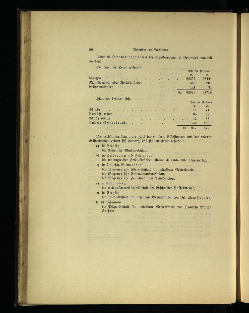 Die verhältnißmäßig große Zahl der Blinden , Blödſinnigen und der anderen Geiſteskranken erklärt ſich dadurch, daß ſich im Kreiſe befinden: a) in Steglitz die Königliche Blinden-AUnſtalt, b) in Schöneberg und Zehlendorf die umfangreichen Irren⸗-Anſtalten Maison de santé und Schweizerhof, c) in Deutſch-Wilmersdorf die Wegener'ſche Pflege⸗Anſtalt für unheilbare Geiſteskranke, die Wegener'ſche Privat-Kranken⸗Anſtalt, die Wegener'ſche Heil⸗Anſtalt für Trunkſüchtige, in Schöneberg die Privat⸗Irren⸗Pflege⸗Anſtalt der Geſchwiſter Haſſelmeyer, in Steglitz die Pflege⸗Anſtalt für unheilbare Geiſteskranke, von Frl. Clara Heydler, in Schönow die Pflege⸗Anſtalt für unheilbare Geiſteskranke von Fräulein Martha Calſow.