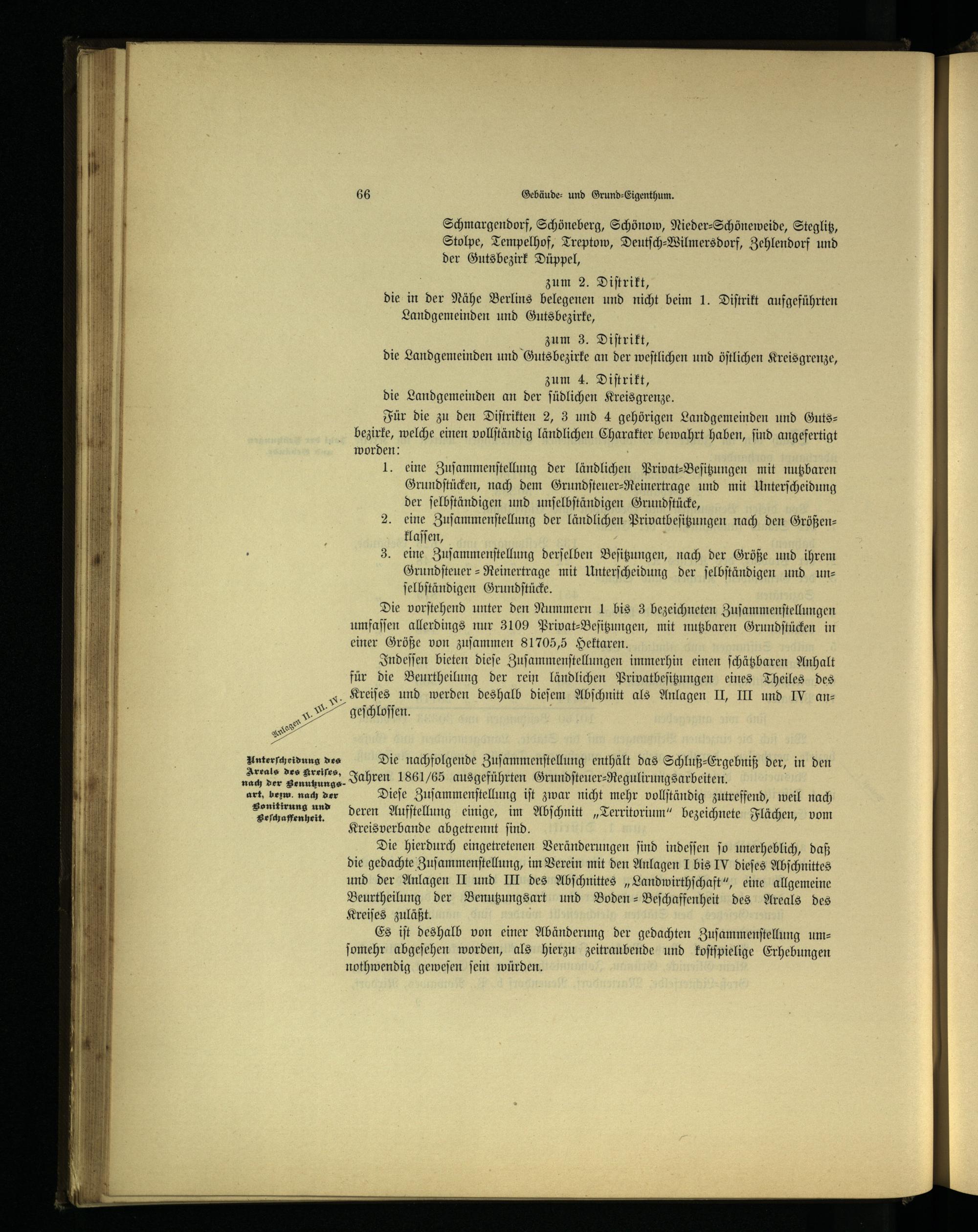 Die vorſtehend unter den Nummern 1 bis 3 bezeichneten Zuſammenſtellungen umfaſſen allerdings nur 3109 Privat-Beſitzungen, mit nutzbaren Grundſtücken in einer Größe von zuſammen 81705,5 Hektaren.