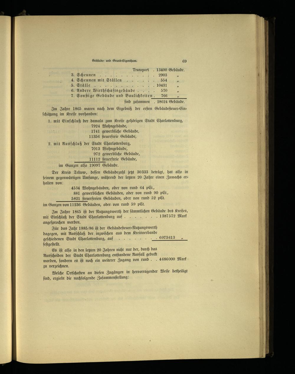 Im Jahre 1865 iſt der Nutzungswerth der ſämmtlichen Gebäude des Kreiſes, mit Einſchluß der Stadt Charlottenburg auf... 1387572 Mark angeſprochen worden.;