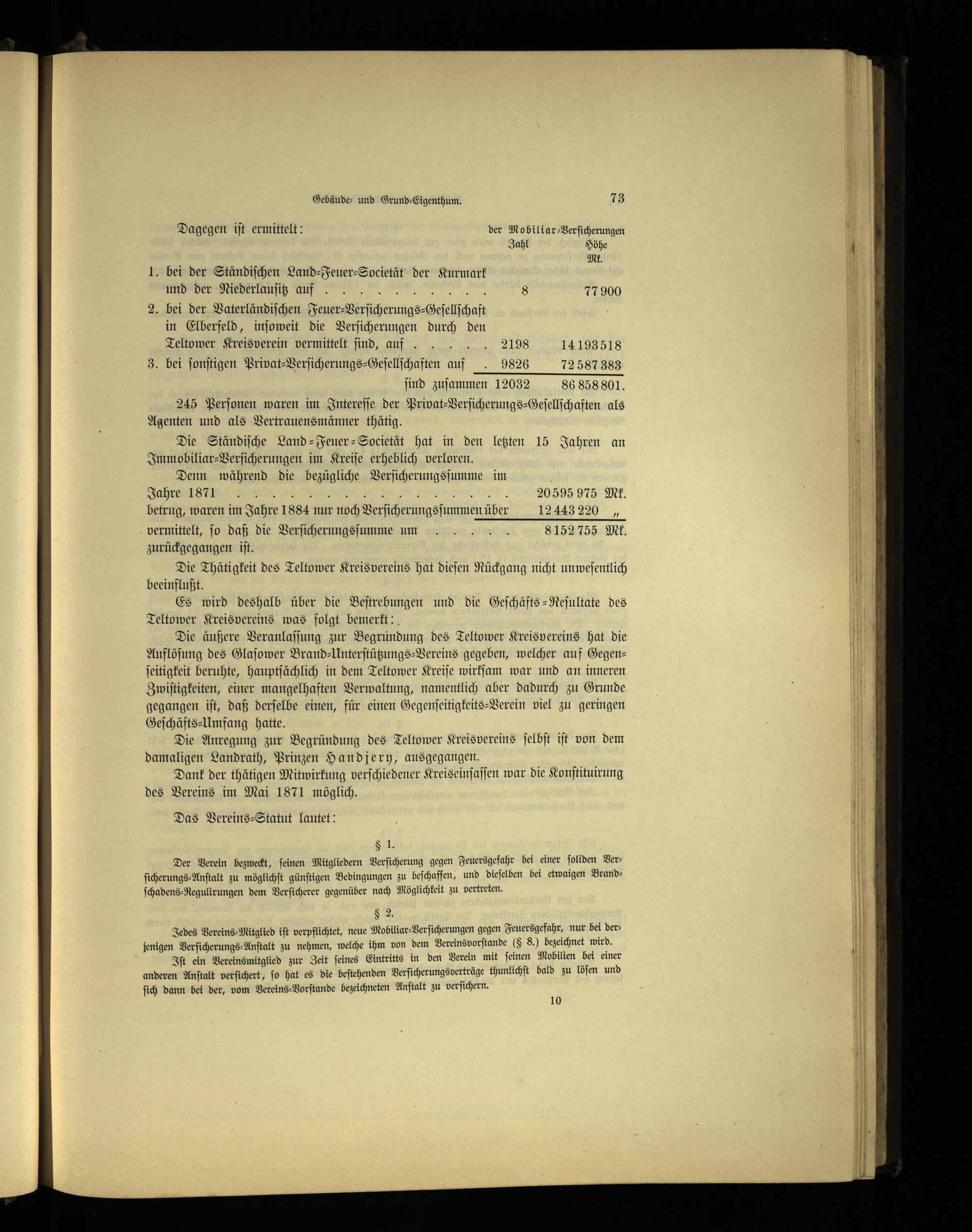 Die äußere Veranlaſſung zur Begründung des Teltower Kreisvereins hat die Auflöſung des Glaſower Brand⸗Unterſtützungs-Vereins gegeben, welcher auf Gegen— ſeitigkeit beruhte, hauptſächlich in dem Teltower Kreiſe wirkſam war und an inneren Zwiſtigkeiten, einer mangelhaften Verwaltung, namentlich aber dadurch zu Grunde gegangen iſt, daß derſelbe einen, für einen Gegenſeitigkeits-Verein viel zu geringen Geſchäfts⸗Umfang hatte.