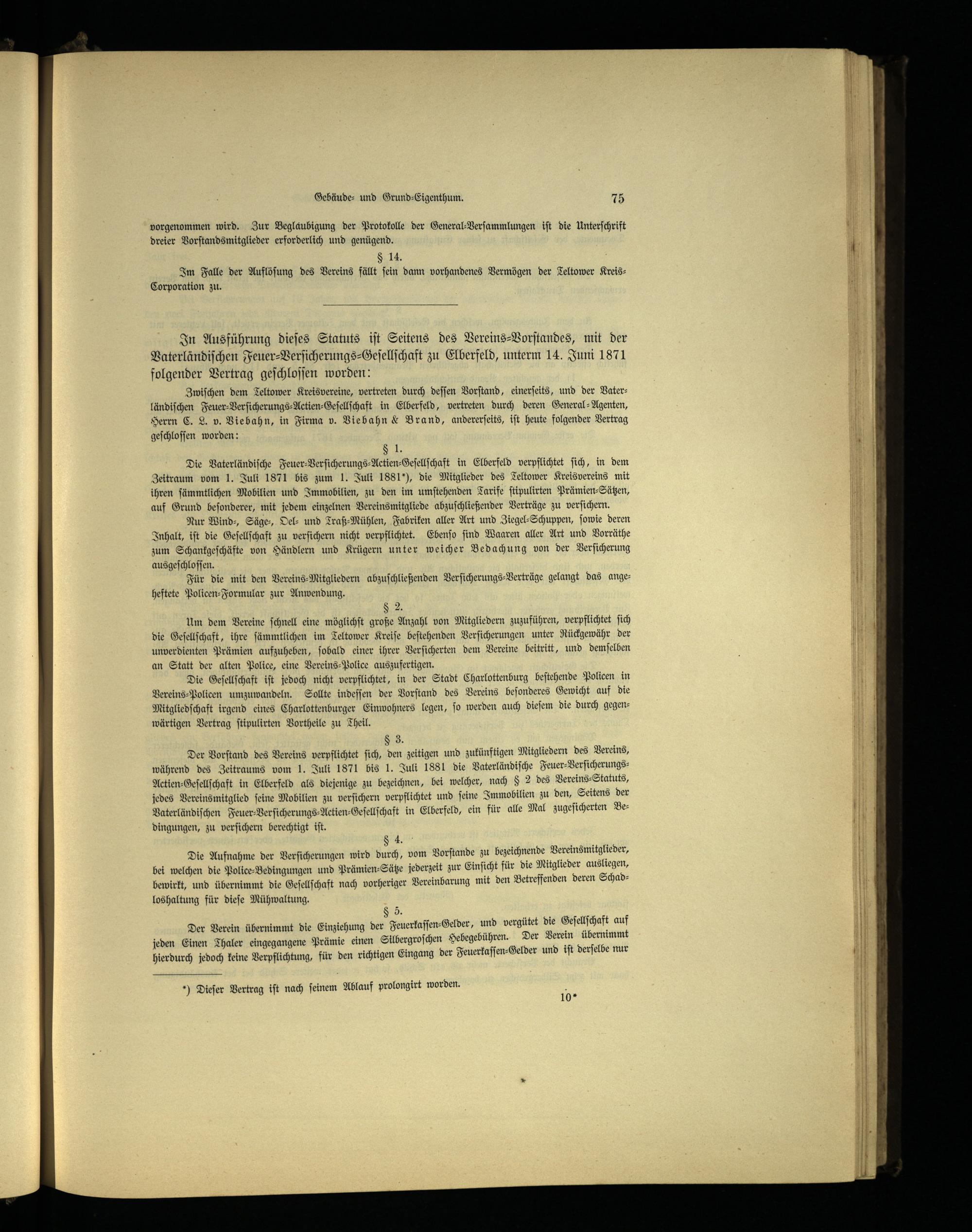 Der Vorſtand des Vereins verpflichtet ſich, den zeitigen und zukünftigen Mitgliedern des Vereins, während des Zeitraums vom 1. Juli 1871 bis 1. Juli 1881 die Vaterländiſche Feuer⸗VerſicherungsAetien-Geſellſchaft in Elberfeld als diejenige zu bezeichnen, bei welcher, nach§ 2 des Vereins⸗-Statuts, jedes Vereinsmitglied ſeine Mobilien zu verſichern verpflichtet und ſeine Immobilien zu den, Seitens der Vaterländiſchen Feuer⸗-Verſicherungs⸗Actien-Geſellſchaft in Elberfeld , ein für alle Mal zugeſicherten Bedingungen, zu verſichern berechtigt iſt.