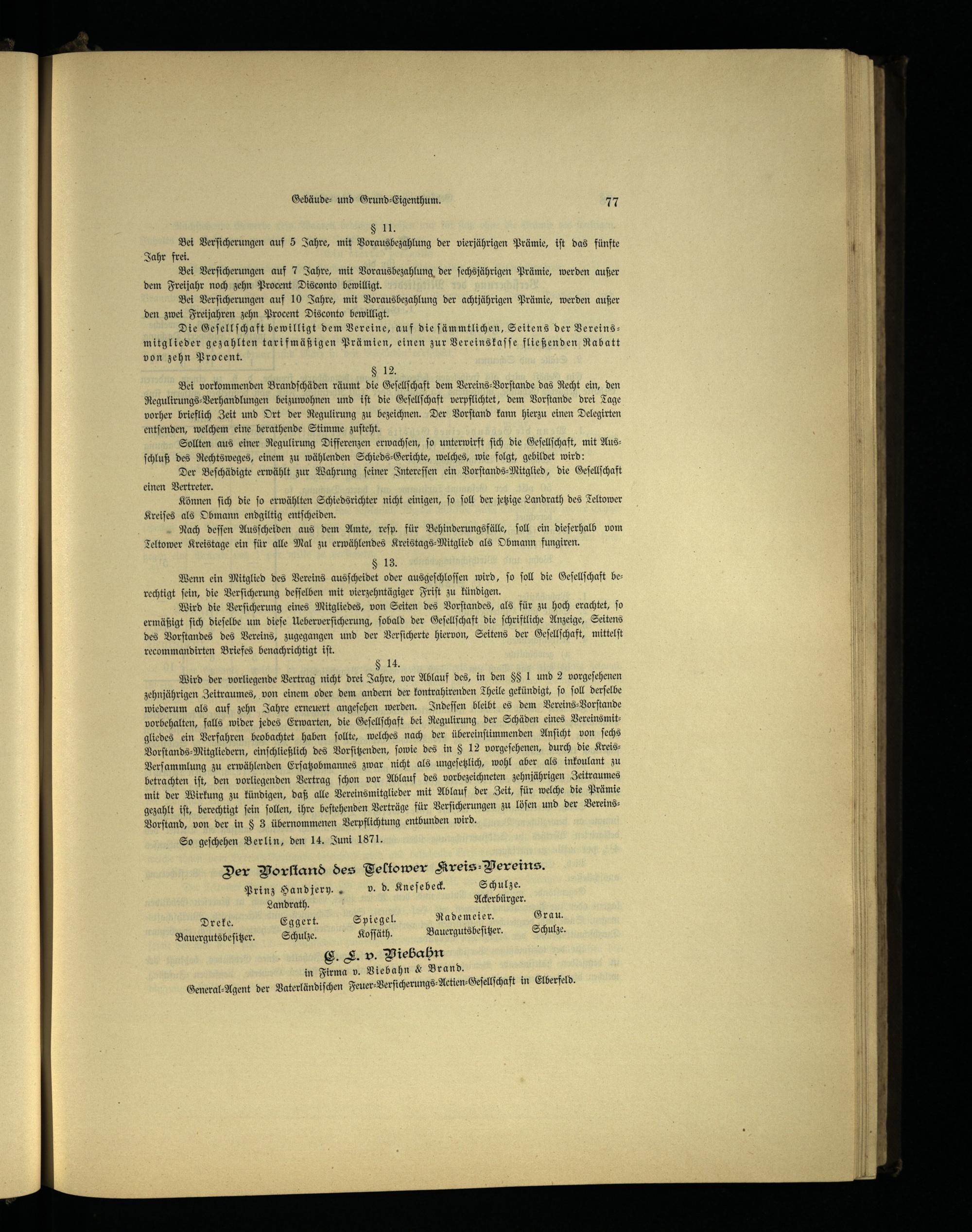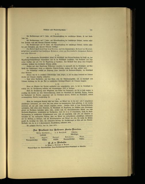 Wird der vorliegende Vertrag nicht drei Jahre, vor Ablauf des, in den$S I und 2 vorgeſehenen zehnjährigen Zeitraumes, von einem oder dem andern der kontrahirenden Theile gekündigt, ſo ſoll derſelbe wiederum als auf zehn Jahre erneuert angeſehen werden. Indeſſen bleibt es dem Vereins⸗Vorſtande vorbehalten, falls wider jedes Erwarten, die Geſellſchaft bei Regulirung der Schäden eines Vereinsmit— gliedes ein Verfahren beobachtet haben ſollte, welches nach der übereinſtimmenden Anſicht von ſechs Vorſtands⸗Mitgliedern, einſchließlich des Vorſitzenden, ſowie des in$ 12 vorgeſehenen, durch die KreisVerſammlung zu erwählenden Erſatzobmannes zwar nicht als ungeſetzlich, wohl aber als inkoulant zu betrachten iſt, den vorliegenden Vertrag ſchon vor Ablauf des vorbezeichneten zehnjährigen Zeitraumes mit der Wirkung zu kündigen, daß alle Vereinsmitglieder mit Ablauf der Zeit, für welche die Prämie gezahlt iſt, berechtigt ſein ſollen, ihre beſtehenden Verträge für Verſicherungen zu löſen und der VereinsVorſtand, von der in 5 3 übernommenen Verpflichtung entbunden wird.