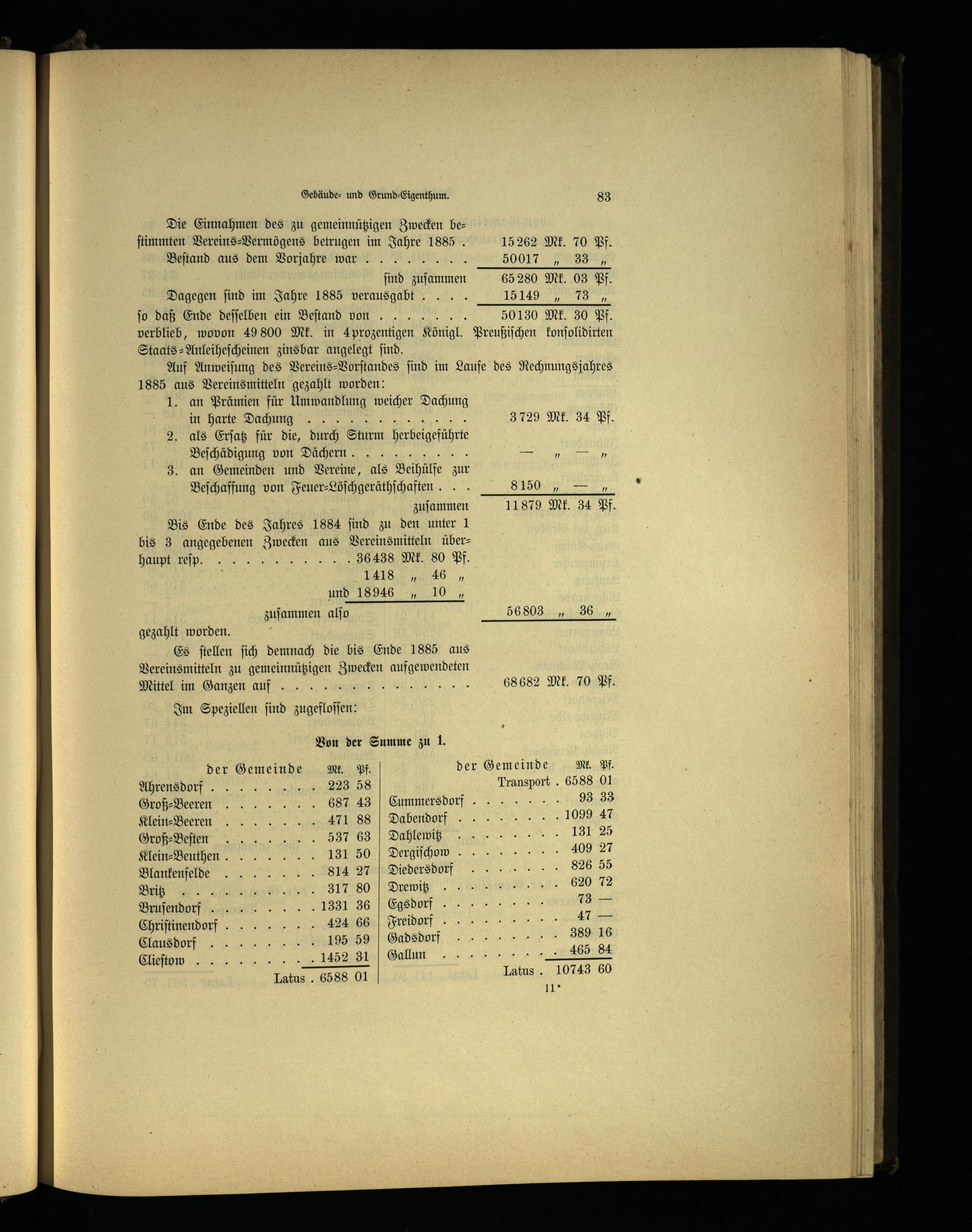 Die Einnahmen des zu gemeinnützigen Zwecken beſtimmten Vereins⸗Vermögens betrugen im Jahre 1885. 15262 Mk. 70 Pf. Beſtand aus dem Vorjahre war 50917 ſind zuſammen 65280 Mk. 03 Pf. Dagegen find im Jahre 1885 verausgabt.... 15149 093 ſo daß Ende deſſelben ein Beſtand von 50130 Mk. 30 Pf. verblieb, wovon 49 800 Mk. in 4prozentigen Königl. Preußiſchen konſolidirten Staats-⸗-Anleiheſcheinen zinsbar angelegt ſind. Auf Anweiſung des Vereins⸗Vorſtandes find im Laufe des Rechnungsjahres 1885 aus Vereinsmitteln gezahlt worden: 1. an Prämien für Umwandlung weicher Dachung in harte Dachung 3729 Mk. 34 Pf. 2. als Erſatz für die, durch Sturm herbeigeführte Beſchädigung von Dächern. 3. an Gemeinden und Vereine, als Beihülfe zur Beſchaffung von Feuer⸗Löſchgeräthſchaften... S150,— zuſammen 11879 Mk. 34 Pf. Bis Ende des Jahres 1884 ſind zu den unter 1 bis 3 angegebenen Zwecken aus Vereinsmitteln über— w b Pf. . 1418„46„ und 18946 10 zuſammen alſo 59 gezahlt worden. Es ſtellen ſich demnach die bis Ende 1885 aus Vereinsmitteln zu gemeinnützigen Zwecken aufgewendeten Mittel im Ganzen auf 68 682 Mk. 70 Pf.