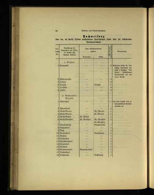 Nachwmeiſnung über die, im Kreiſe Teltow vorhandenen Feuerſpritzen ſomie über die beſtehenden . Spritz enverbände.