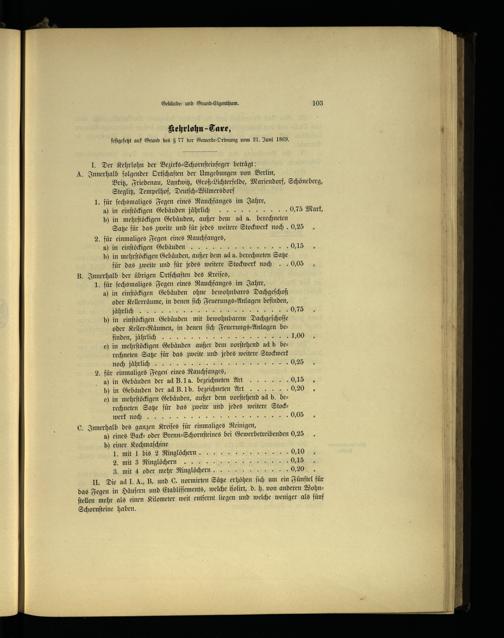 B. Innerhalb der übrigen Ortſchaften des Kreiſes, 1. für ſechsmaliges Fegen eines Rauchfanges im Jahre, a) in einſtöckigen Gebäuden ohne bewohnbares Dachgeſchoß oder Kellerräume, in denen ſich Feuerungs⸗Anlagen befinden, jährlich b) in einſtctigen Gebäuden mit bewohnbarem Dach geſchof oder Keller⸗Räumen, in denen ſich Feuerungs⸗Anlagen befinden, jährlich. c) in mehrſtöckigen Gebäuden: außer bem vorſtehend ad b be rechneten Satze für das zweite und jedes weitere Stockwerk noch jährlich für einmaliges Fegen eines MRauchfanges, a) in Gebäuden der ad B. 12. bezeichneten Art b) in Gebäuden der ad B. 1b. bezeichneten Arttꝛtꝛt.. 0,20 c) in mehrſtöckigen Gebäuden, außer dem vorſtehend ad b. berechneten Satze für das zweite und jedes weitere Stockwerk noch.. 97166359695 C. Innerhalb des ganzen Kreiſes für einmaliges Reinigen, a) eines Back- oder Brenn⸗Schornſteines bei Gewerbetreibenden 0,25 b) einer Kochmaſchine 1. mit 1. bis 2 Ringlöchern 0,10 2. mit 3 Ringlöcheerrr(2011 3. mit 4 oder mehr Ringlochern, 8929 II. Die ad J. A., B. und C. normirten Sätze erhöhen ſich um ein Fünftel Für das Fegen in Hauſern und Etabliſſements, welche iſolirt, d. h. von anderen Wohnſtellen mehr als einen Kilometer weit entfernt liegen und welche weniger als fünf