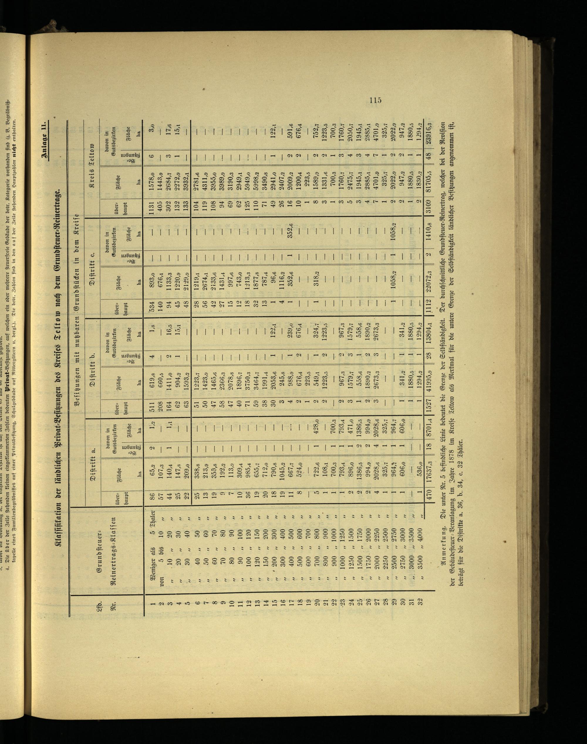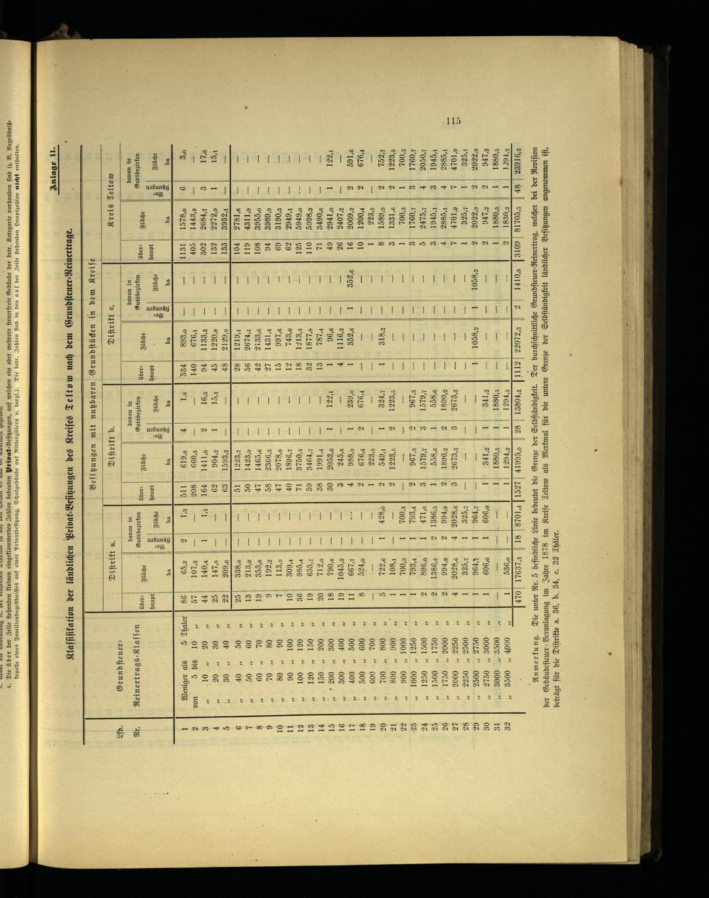 355,6 1465,55 w 192, 2366, N 6, 90 113,5 2078,68 5 997,6 90„ 100 309, 1896, 21° 748,0 o, 120 3 985,4 3750,3; 1213,3 120 ,, 150 U 655,7| 3464,7| 1877,8 6 200 201 712,0 I| 1991,4|. 787,4 200 1, 300° u. 790,8 300„ 400 1045, 400 500 667,7 500 600 524,9 600 700| 700 800 7226| 1 428, 800 900 108,1— 900 1000 700,3 700,3 1000 1250 793,4| 793,4 967,3| 1250 1500! 896,0|| 471,0 1579,7| 1500„ 1750 1386, 1386, 558,, 1750 2000 994,9.|| 994,9 1890,2| 2000 2250 2028,6 4 2028, 2678,3_ 2250 2500 825,7 825,7|| 2500„ 2750 9643 964,7| FA 1058,2 2750 3000 606,0 606,0 341,2 1 3000„ 3500 lissos 1 3500„4000 536,9 12945 1 | 17637,3|. 11995,|| 28 Anmerkung. Die unter Nr. 5 befindliche Linie bedeutet die Grenze der Selbſtändigkeit. Der durchſchnittliche Grundfteuer-Reinertrag, welcher bei der Reviſion der Gebäudeſteuer-Veranlagung im Jahre 1878 im Kreiſe Teltow als Merkmal für die untere Grenze der Selbſtändigkeit ländlicher Beſitzungen angenommen iſt, beträgt für die Diſtrikte a. 36, b. 34, c. 32 Thaler.