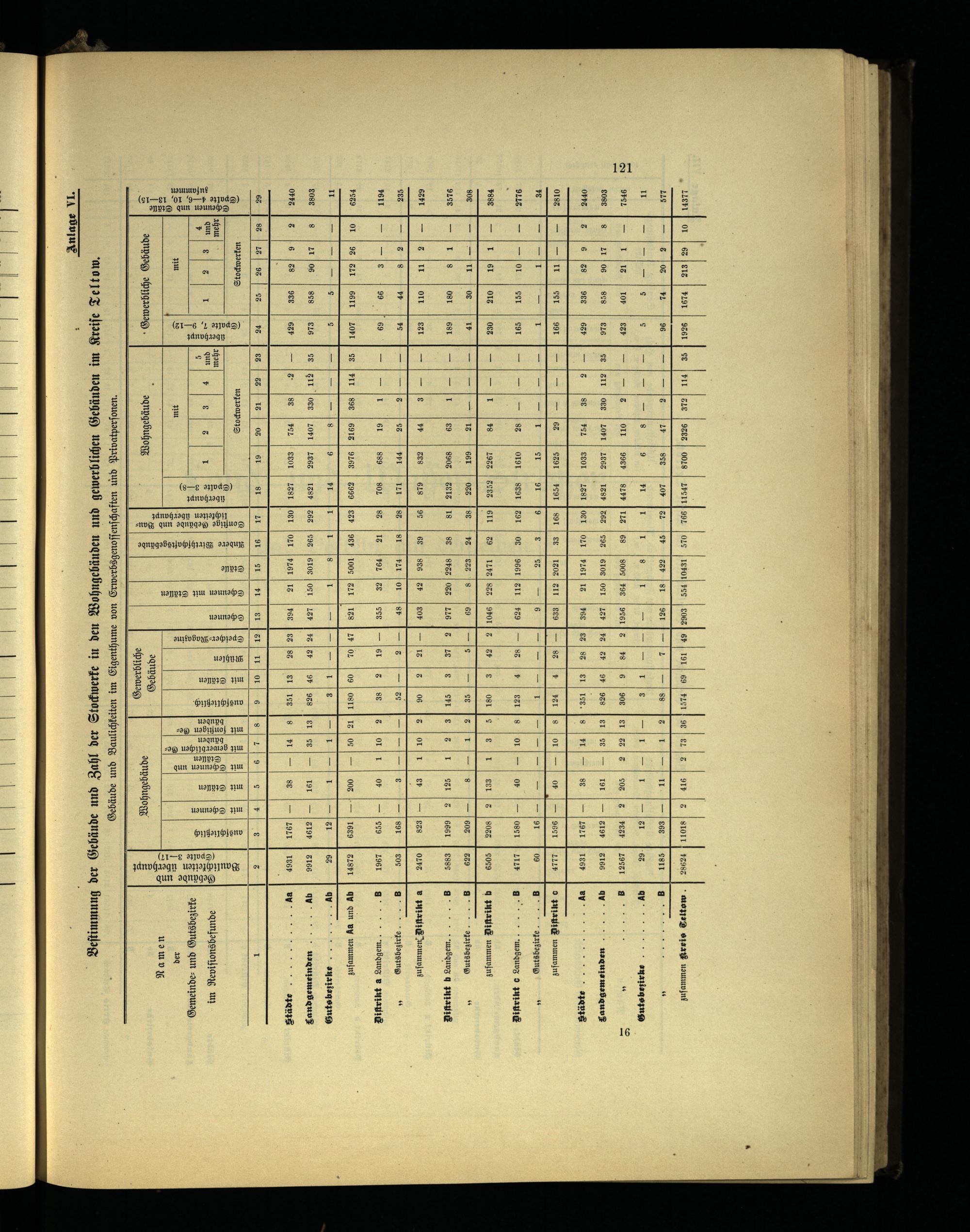 Beſtimmung der Gebäude und Zahl der Stockwerke in den Wohngebäuden und gewerblichen Gebäuden im Kreiſe Teltow