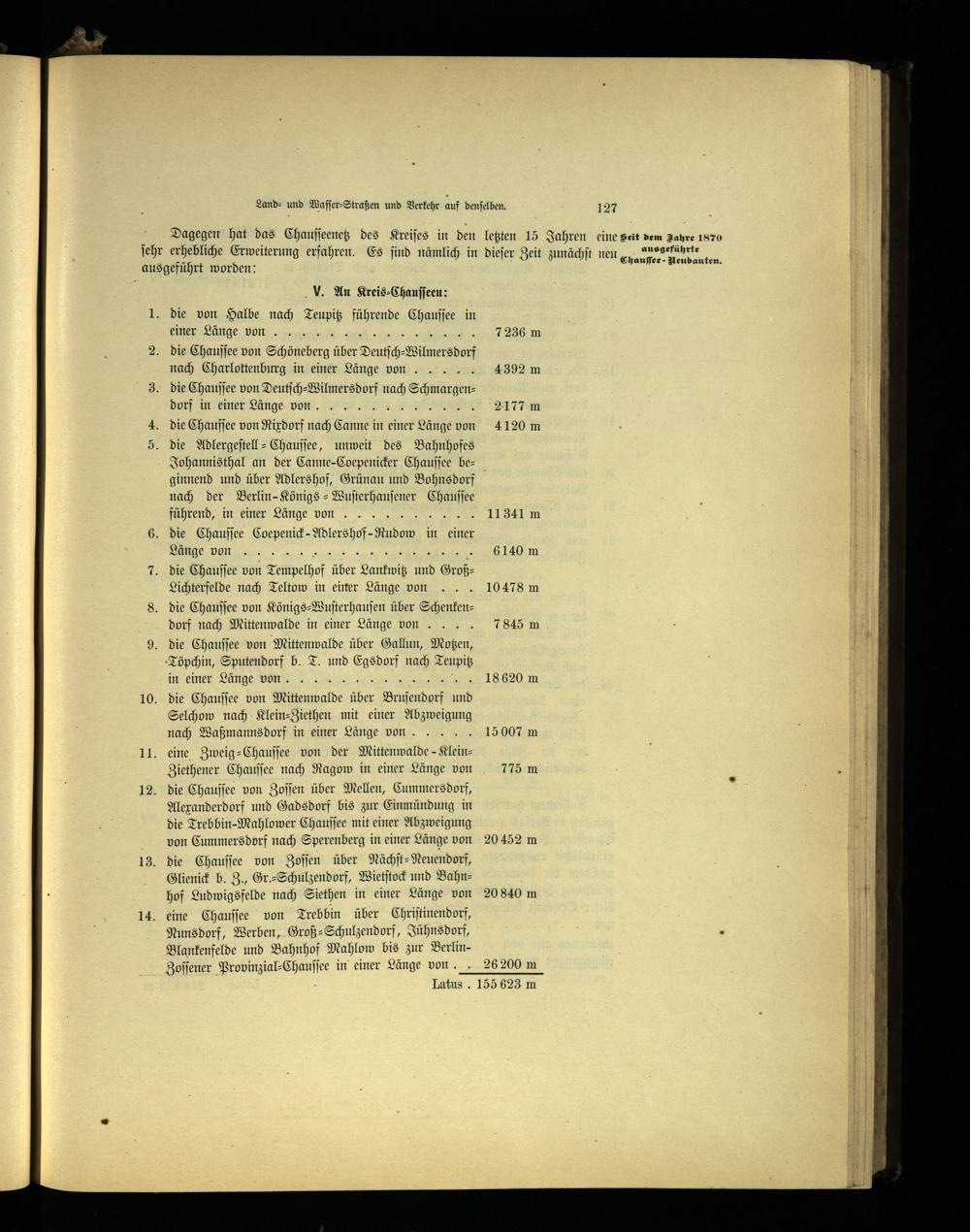 die von Halbe nach Teupitz führende Chauſſee in einer Länge von.. die Chauſſee von Schöneberg über Deutſch-Wilmersdorf nach Charlottenburg in einer Länge von. 3. die Chauſſee von Deutſch⸗ . ö. dorf in einer Länge von. die Chauſſee von Rixdorf nach gan in einer Lange von 5. die Adlergeſtell-Chauſſee, unweit des Bahnhofes Johannisthal an der Canne-Coepenicker Chauſſee beginnend und über Adlershof , Grünau und Bohnsdorf nach der Berlin -Königs⸗-Wuſterhauſener Chauſſee führend, in einer Länge von.. 11341 m die Chauſſee Coepenick-Adlershof⸗Rudow in einer de don 6140 m die Chauſſee von Tempelhof über Dank vin und GroßLichterfelde nach Teltow in einer Länge von... 10478 m die Chauſſee von Königs⸗Wuſterhauſen über Schenkendorf nach Mittenwalde in einer Länge von.... 7845 m die Chauſſee von Mittenwalde über Gallun, Motzen , Töpchin, Sputendorf b. T. und Egsdorf nach Teupitz in einer Länge von. 18620 m 10. die Chauſſee von Mittenwalde iber Oriſendorf. Selchow nach Klein⸗Ziethen mit einer Abzweigung nach Waßmannsdorf in einer Länge von.... 15 007 m eine Zweig-Chauſſee von der Mittenwalde — KleinZiethener Chauſſee nach Ragow in einer Länge von 775 m die Chauſſee von Zoſſen über Mellen, Cummersdorf, Alexanderdorf und Gadsdorf bis zur Einmündung in die Trebbin⸗Mahlower Chauſſee mit einer Abzweigung von Cummersdorf nach Sperenberg in einer Länge von die Chauſſee von Zoſſen über Nächſt-Neuendorf, Glienick b. 3, Gr-Schulzendorf, Wietſtock und Bahnhof Ludwigsfelde nach Siethen in einer Länge von 20 840 m eine Chauſſee von Trebbin über Chriſtinendorf, Nunsdorf, Werben, Groß-⸗Schulzendorf, Jühnsdorf, Blankenfelde und Bahnhof Mahlow bis zur Berlin = Zoſſener Provinzial⸗Chauſſee in einer Länge von. 26200 m . Latus. 155 623 m
