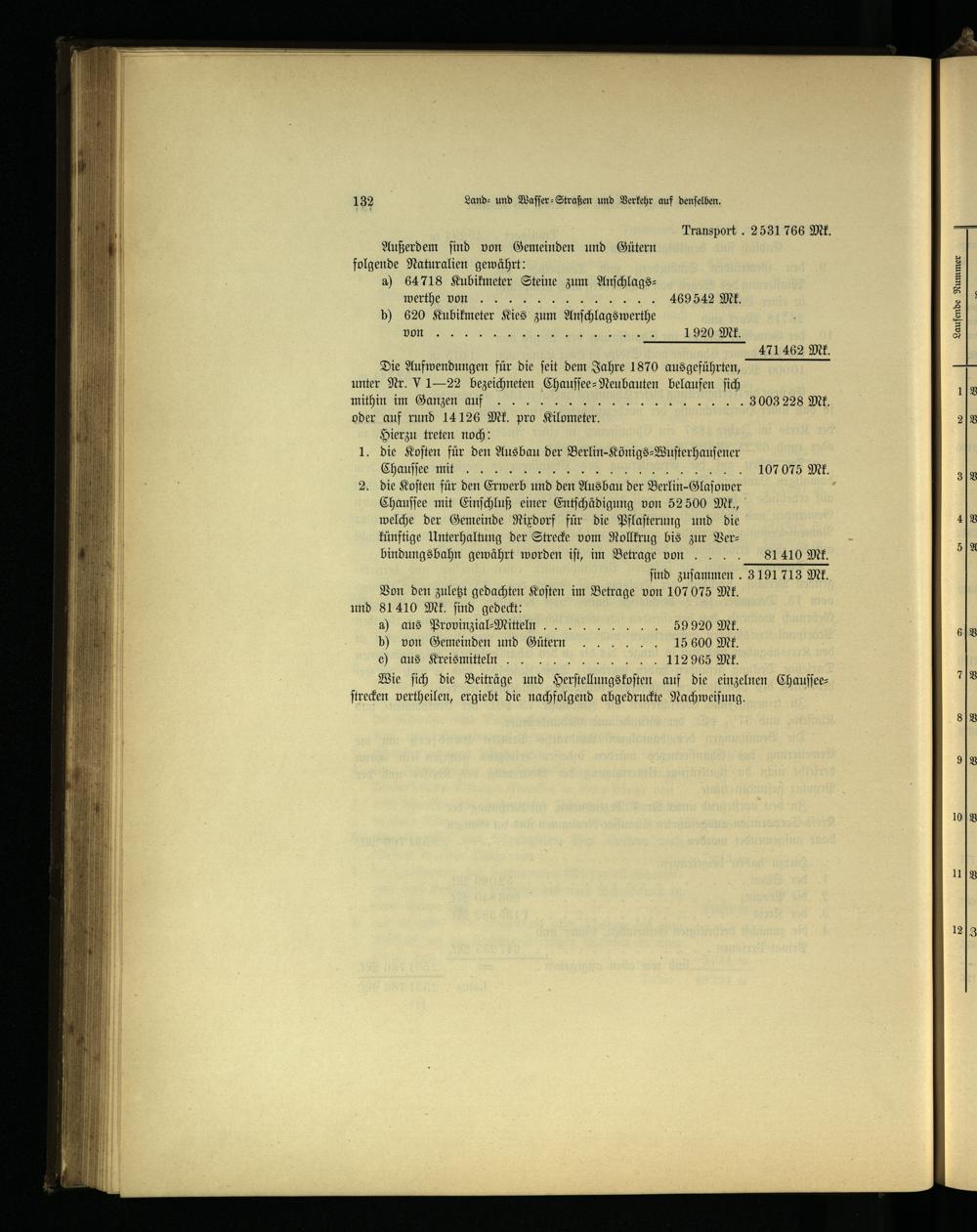 Transport. 2531 766 Mk. Außerdem ſind von Gemeinden und Gütern folgende Naturalien gewährt: a) 64718 Kubikmeter Steine zum Anſchlagswerthe von 469 542 Mk. b) 620 Kubikmeter Kies zum Anſchlagswerthe 1920 Mk. K.. Die Aufwendungen für die ſeit dem Jahre 1870 ausgeführten, unter Nr. V1- 22 bezeichneten Chauſſee⸗Neubauten belaufen ſich mithin im Ganzen auf 3 003228 Mk. oder auf rund 14126 Mk. pro Kilometer. Hierzu treten noch: 1. die Koſten für den Ausbau der Berlin -⸗Königs⸗Wuſterhauſener Chauſſee mit J 107075 WM. 2. die Koſten für den Erwerb und den Ausbau der Berlin -Glaſower ö Chauſſee mit Einſchluß einer Entſchädigung von 52500 Mk., welche der Gemeinde Rixrdorf für die Pflaſterung und die künftige Unterhaltung der Strecke vom Rollkrug bis zur Verbindungsbahn gewährt worden iſt, im Betrage von.. 81 410 Mk. ſind zuſammen. 3191 713 Mk. Von den zuletzt gedachten Koſten im Betrage von 107075 Mk. 81410 Mk. ſind gedeckt: a) dus Bion ng... 59920 ME. b) von Gemeinden und Gütern.. 15600 Mk. JI..... 2... 1.. 112965 WM. Wie ſich die Beiträge und Herſtellungskoſten auf die einzelnen Chauſſeeſtrecken vertheilen, ergiebt die nachfolgend abgedruckte Nachweiſung.