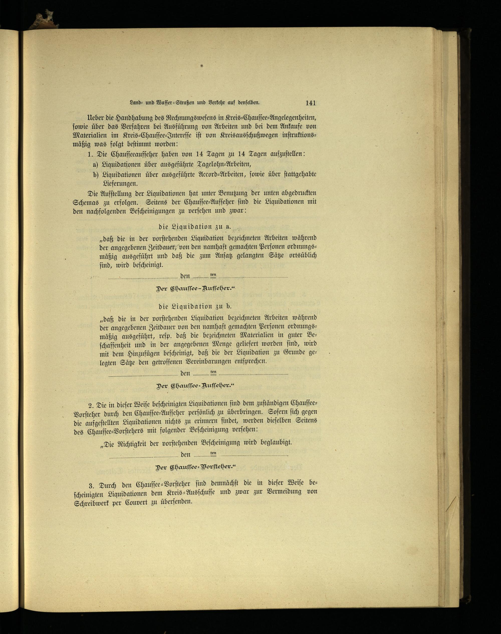 2. Die in dieſer Weiſe beſcheinigten Liquidationen ſind dem zuſtändigen ChauſſeeVorſteher durch den Chauſſee⸗Aufſeher perſönlich zu überbringen. Sofern ſich gegen die aufgeſtellten Liquidationen nichts zu erinnern findet, werden dieſelben Seitens des Chauſſee⸗Vorſtehers mit folgender Beſcheinigung verſehen: