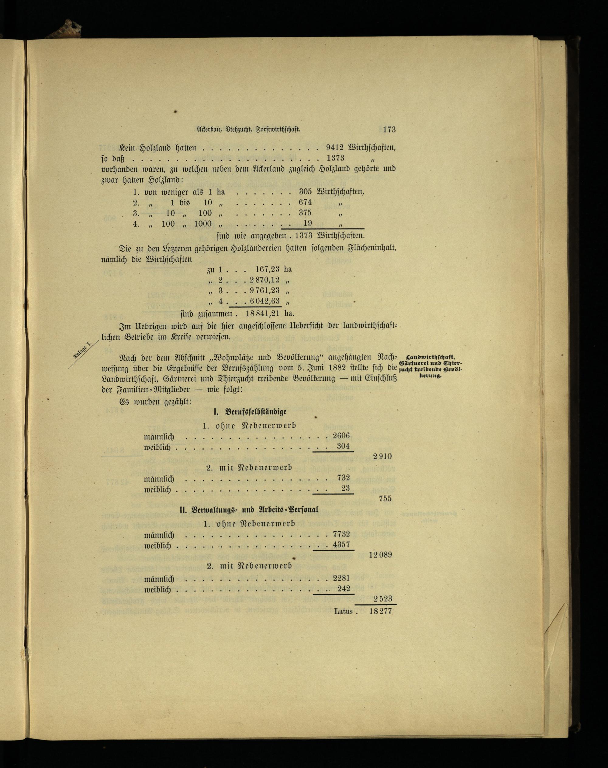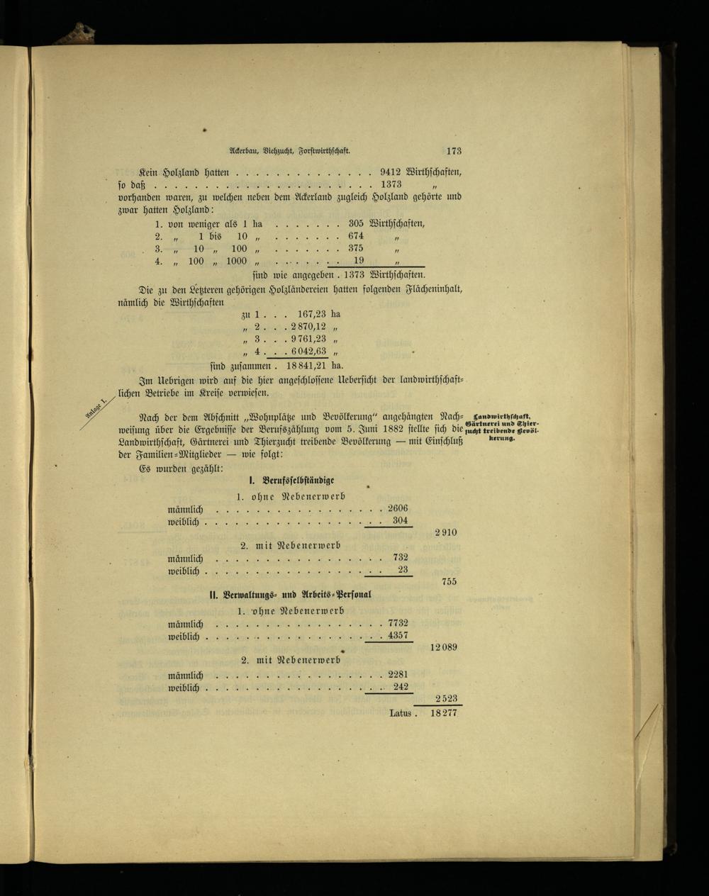 Nach der dem Abſchnitt„Wohnplätze und Bevölkerung“ angehängten Nach- gandwiethſchatt, weifung über die Ergebniſſe der Berufszählung vom 5. Juni 1882 ſtellte ſich die er,, Dear Landwirthſchaft, Gärtnerei und Thierzucht treibende Bevölkerung— mit Einſchluß K der Familien= Mitglieder— wie folgt: