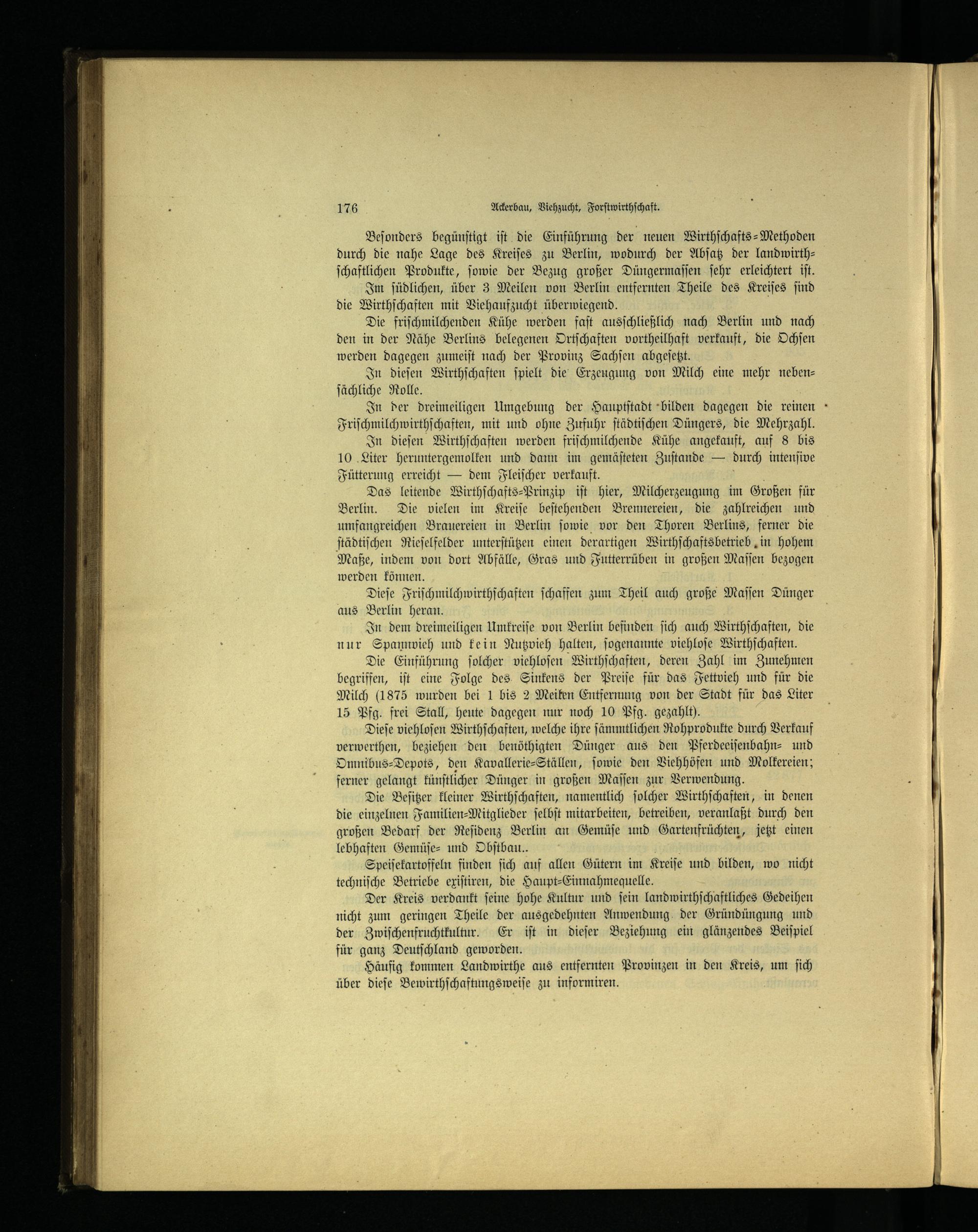 Das leitende Wirthſchafts-Prinzip iſt hier, Milcherzeugung im Großen für Berlin . Die vielen im Kreiſe beſtehenden Brennereien, die zahlreichen und umfangreichen Brauereien in Berlin ſowie vor den Thoren Berlins , ferner die ſtädtiſchen Rieſelfelder unterſtützen einen derartigen Wirthſchaftsbetrieb, in hohem Maße, indem von dort Abfälle, Gras und Futterrüben in großen Maſſen bezogen werden können.