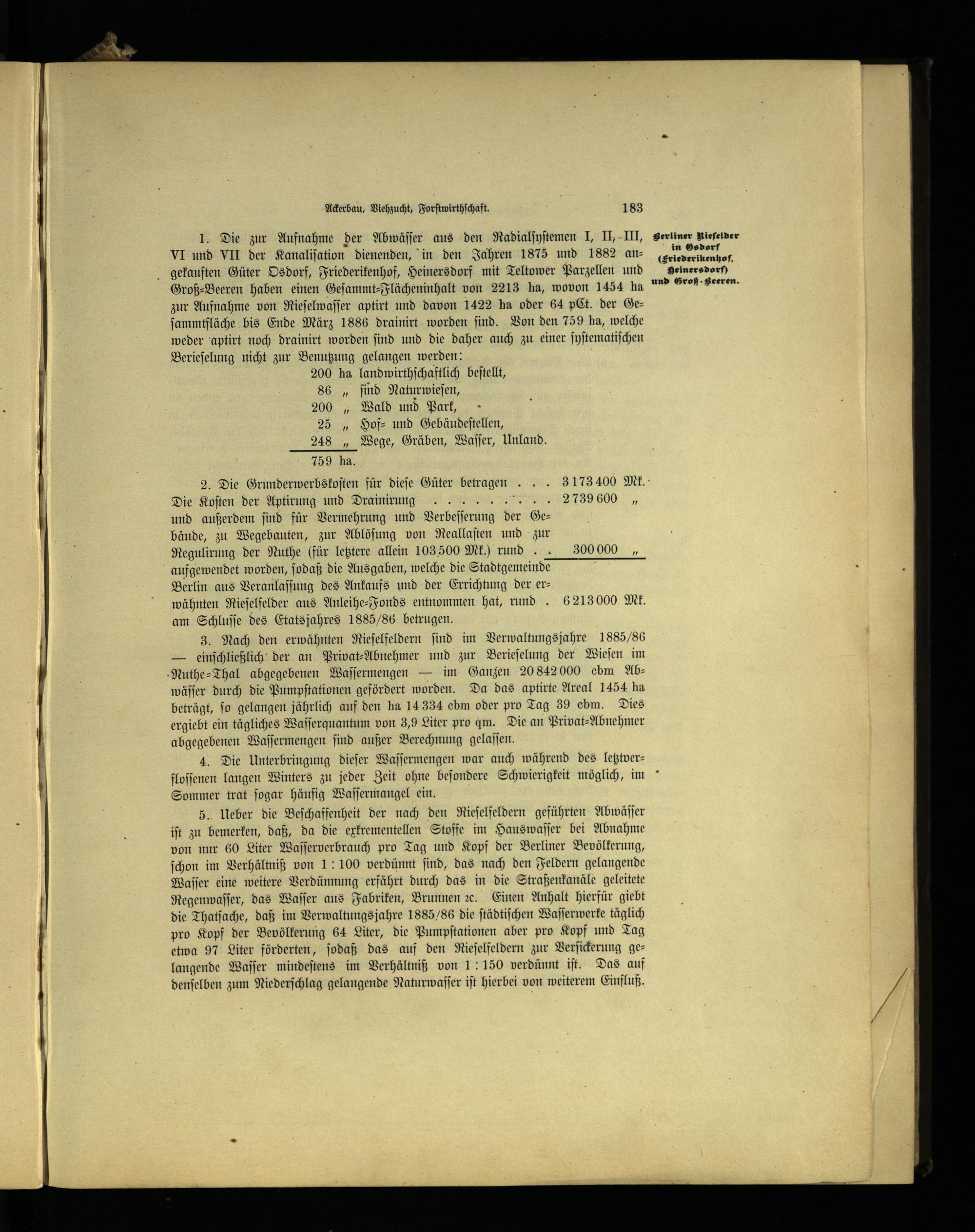 Groß⸗Beeren haben einen Geſammt⸗-Flächeninhalt von 2213 ha, wovon 1454 ha zur Aufnahme von Rieſelwaſſer aptirt und davon 1422 ha oder 64 pCt. der Ge— ſammtfläche bis Ende März 1886 drainirt worden find. Von den 759 ha, welche weder aptirt noch drainirt worden ſind und die daher auch zu einer ſyſtematiſchen Berieſelung nicht zur Benutzung gelangen werden:
