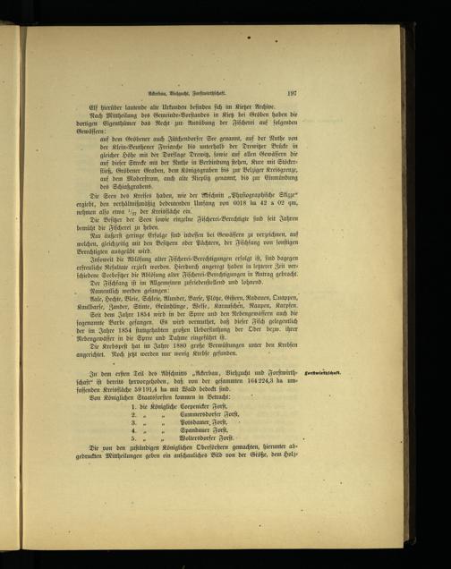 Kaulbarſe, Zander, Stinte, Gründlinge, Welſe, Karauſchen, Raapen, Karpfen. Seit dem Jahre 1854 wird in der Spree und den Nebengewäſſern auch die ſogenannte Barbe gefangen. Es wird vermuthet, daß dieſer Fiſch gelegentlich der im Jahre 1854 ſtattgehabten großen Ueberfluthung der Oder bezw. ihrer Nebengewäſſer in die Spree und Dahme eingeführt iſt. Die Krebspeſt hat im Jahre 1880 große Verwüſtungen unter den Krebſen angerichtet. Noch jetzt werden nur wenig Krebſe.