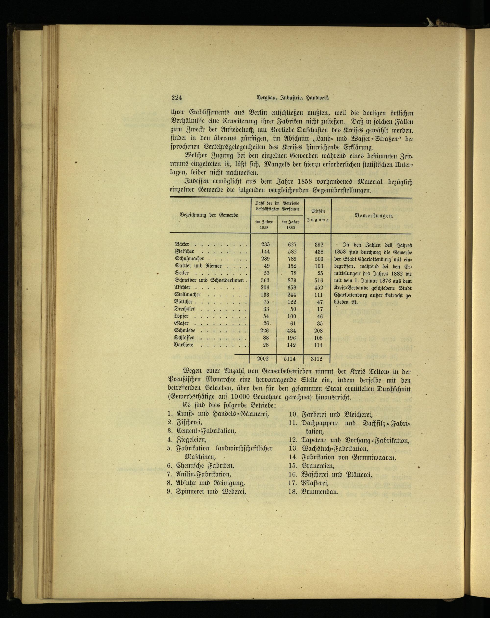 In den Zahlen des Jahres 1858 ſind durchweg die Gewerbe Schuhmacher ö 5 der Stadt Charlottenburg mit einSattler und Riemer.... 5% begriffen, während bei den ErSeiler; mittelungen des Jahres 1882 die Schneider und Schneiderinnen. 5 mit dem 1. Januar 1876 aus dem Tiſchler 5 Kreis-Verbande geſchiedene Stadt Stellmacher Charlottenburg außer Betracht geBöttcher blieben iſt.