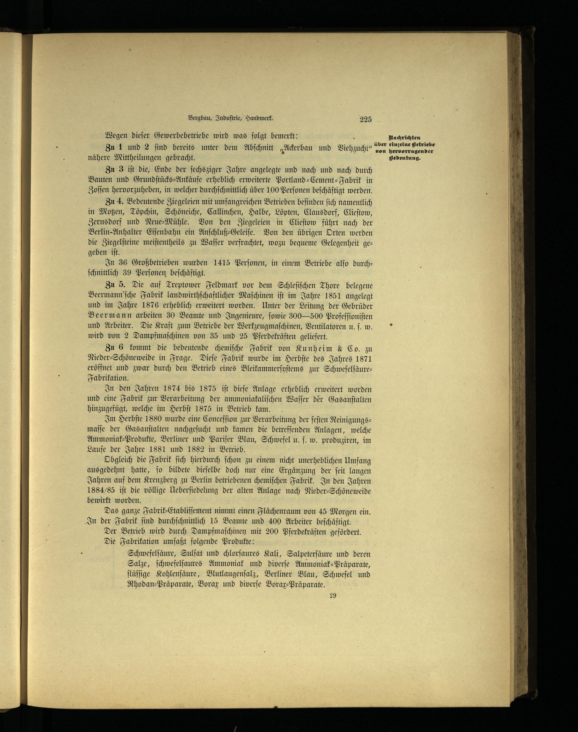 Zu 3 iſt die, Ende der ſechsziger Jahre angelegte und nach und nach durch Bauten und Grundſtücks⸗Ankäufe erheblich erweiterte Portland-Cement-Fabrik in Zoſſen hervorzuheben, in welcher durchſchnittlich über 100 Perſonen beſchäftigt werden.