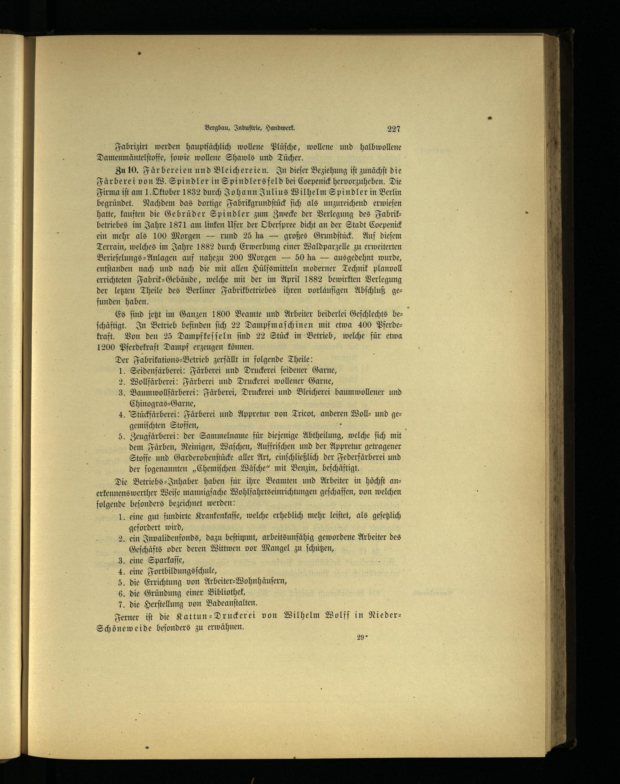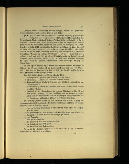 Zu 10. Färbereien und Bleichereien. In dieſer Beziehung iſt zunächſt die Färberei von W. Spindler in Spindlersfeld bei Coepenick hervorzuheben. Die Firma iſt am 1. Oktober 1832 durch Johann Julius Wilhelm Spindler in Berlin begründet. Nachdem das dortige Fabrikgrundſtück ſich als unzureichend erwieſen hatte, kauften die Gebrüder Spindler zum Zwecke der Verlegung des Fabrik— betriebes im Jahre 1871 am linken Ufer der Oberſpree dicht an der Stadt Coepenick ein mehr als 100 Morgen— rund 25 ha— großes Grundſtück. Auf dieſem Terrain, welches im Jahre 1882 durch Erwerbung einer Waldparzelle zu erweiterten Berieſelungs-Anlagen auf nahezu 200 Morgen— 50 ha— ausgedehnt wurde,