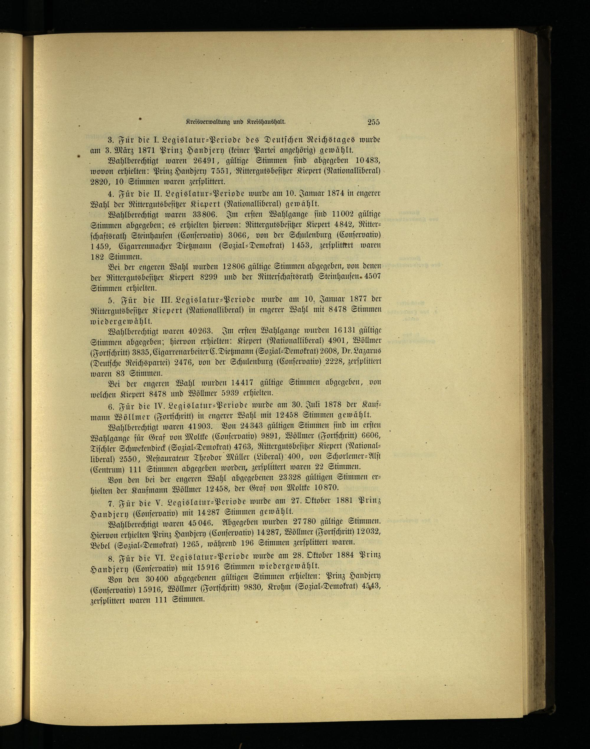 8. Für die VI. Legislatur⸗-Periode wurde am 28. Oktober 1884 Prinz Handjery(Conſervativ) mit 15916 Stimmen wiedergewählt.
