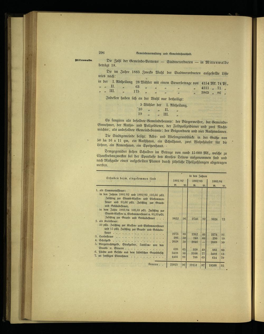 1. als Communalſteuer: in den Jahren 1881/82 und 1882,83 116,66 pCt. Zuſchlag zur Staats⸗-Klaſſen⸗ und Einkommen— ſteuer und 91,66 pCt. Zuſchlag zur Grund und Gebäudeſteuer, in dem Jahre 1883,84 108,33 pCt. Zuſchlag zur Staats ⸗Klaſſen⸗ u. Einkommenſteuer u. 833,33 pCt. Zuſchlag zur Grund⸗ und Gebäudeſteuer als Kreisſteuer:. 30 pCt. Zuſchlag zur Klaſſen- und Einkommenſteuer und 15 pCt. Zuſchlag zur Grund- und Gebäude: ö ſteuer. 2269 2274 3. Hundeſteuer? 50 230 Schulgeld 206 50 2068 5. Bürgerrechtsgeld, Strafgelder, Tantisme von den Staats⸗ ꝛc. Steuerrntt 38 63 9 49 883 80 3. Pächte und Gefälle aus dem ſtädtiſchen Grundbeſitz 34 50 3 77 3492 13 an ſonſtigen Einnahmen; 99 788 69 614 ———————— Summa. 3025 96 19151 87 18588