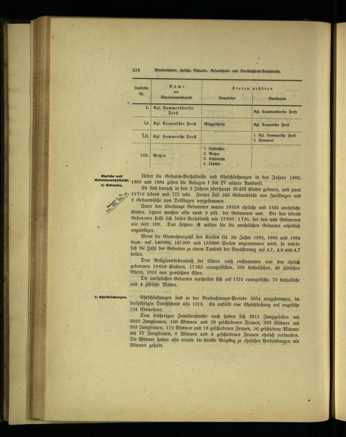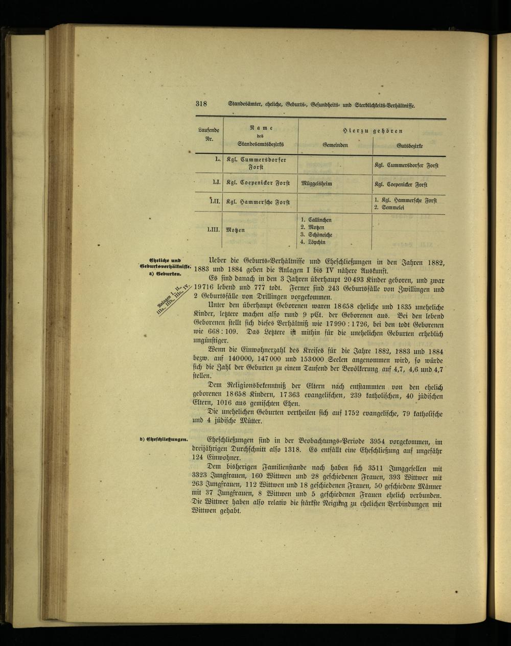 Ueber die Geburts⸗Verhältniſſe und Eheſchließungen in den Jahren 1882, 1883 und 1884 geben die Anlagen I bis IV nähere Auskunft. Es find danach in den 3 Jahren überhaupt 20 493 Kinder geboren, und zwar