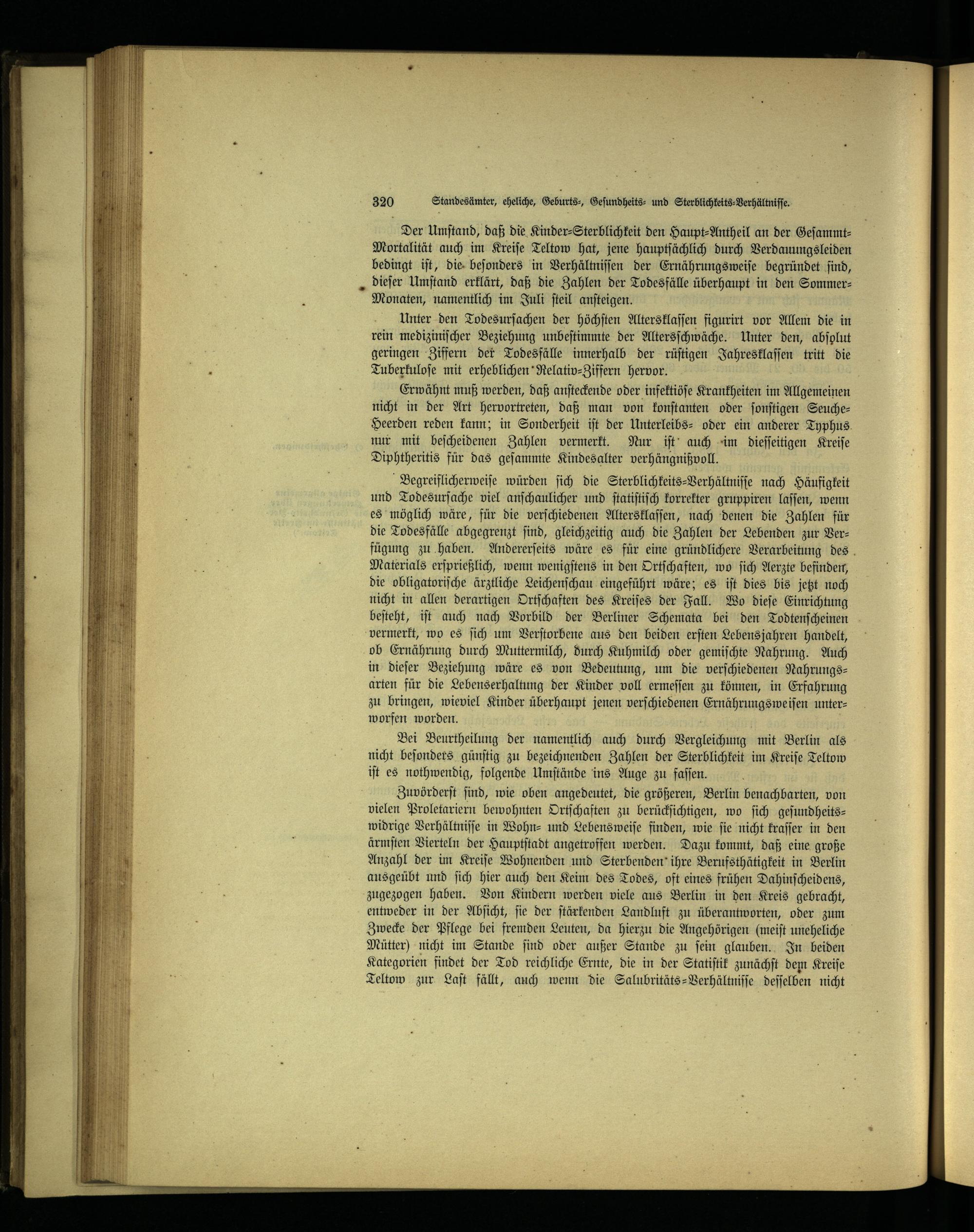 Zuvörderſt find, wie oben angedeutet, die größeren, Berlin benachbarten, von vielen Proletariern bewohnten Ortſchaften zu berückſichtigen, wo ſich geſundheitswidrige Verhältniſſe in Wohn- und Lebensweiſe finden, wie ſie nicht kraſſer in den ärmſten Vierteln der Hauptſtadt angetroffen werden. Dazu kommt, daß eine große Anzahl der im Kreiſe Wohnenden und Sterbenden ihre Berufsthätigkeit in Berlin ausgeübt und ſich hier auch den Keim des Todes, oft eines frühen Dahinſcheidens, zugezogen haben. Von Kindern werden viele aus Berlin in den Kreis gebracht, entweder in der Abſicht, ſie der ſtärkenden Landluft zu überantworten, oder zum Zwecke der Pflege bei fremden Leuten, da hierzu die Angehörigen(meiſt uneheliche Mütter) nicht im Stande ſind oder außer Stande zu ſein glauben. In beiden Kategorien findet der Tod reichliche Ernte, die in der Statiſtik zunächſt dem Kreiſe Teltow zur Laſt fällt, ö. wenn die Salubritäts⸗-Verhältniſſe deſſelben nicht