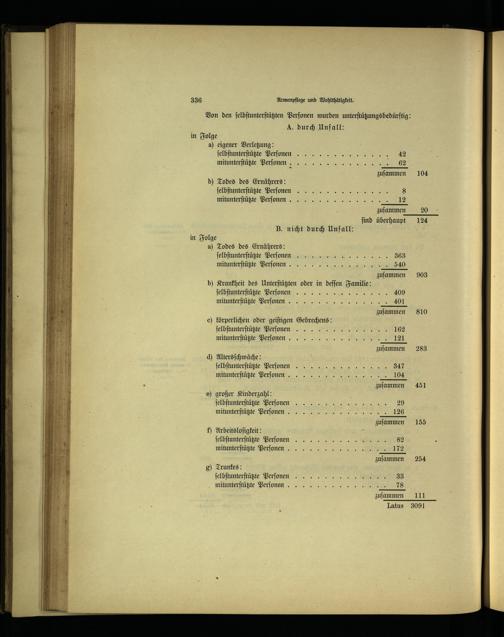 in Folge a) eigener Verletzung: ſelbſtunterſtützte Perſonen mitunterſtützte Perſonen. zuſammen b) Todes des Ernährers: ſelbſtunterſtützte Perſonen... J 8 mitunterſtützte Perſonen.. w zuſammen ſind überhaupt B. nicht durch Unfall: in Folge a) Todes des Ernährers: ſelh tun ter ißt n, nn,, en 0 u. 068 mitunterſtützte Berfonen..... 579 zuſammen b) Krankheit des Unterſtützten oder in deſſen Familie: ſelbſtunterſtützte Perſonen J mitunterſtützte Berjonen..... J zuſammen c) körperlichen oder geiſtigen Gebrechens: ſelbſtunterſtüht B ſoneeenn. mitunter i mei 0 N RE zuſammen d) Altersſchwäche: ſelbſtunterſtützte Perſonen. J mitunterſtützte Perſonen... J . zuſammen