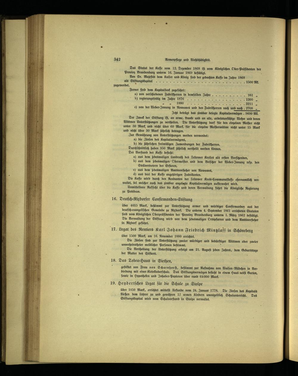 Das Statut der Kaſſe vom 12. Dezember 1868 iſt vom Königlichen Ober-Präſidenten der Provinz Brandenburg unterm 16. Januar 1869 beſtätigt.; Von Sr. Majeſtät dem Kaiſer und König ſind der gedachten Kaſſe im Jahre 1868 als Stiftungskapital 1500 Mk. zugewendet.. Ferner ſind dem Kapitalſtock zugeführt:; a) von verſchiedenen Fabrikherren in demſelben Jahre K b) regierungsſeitig im Jahre 1876 ö ” y, 1880” c) von der Weber-Innung in Nowawes und den Fabrikherren nach und nach. 2708, Jetzt beträgt das zinsbar belegte Kapitalvermögen. 9600 ME. Der Zweck der Stiftung iſt, an arme, kranke und an alte, arbeitsunfähige Weber und deren Wittwen Unterſtützungen zu vertheilen. Die Unterſtützung darf für den einzelnen Meiſter nicht unter 30 Mark, und nicht über 60 Mark, für die einzelne Meiſterwittwe nicht unter 15 Mark und nicht über 30 Mark jährlich betragen.. Zur Gewährung von Unterſtützungen werden verwendet: a) die Zinſen des Kapitalvermögens, b) die jährlichen freiwilligen Zuwendungen der Fabrikherren. Durchſchnittlich haben 950 Mark jährlich vertheilt werden können. Der Vorſtand der Kaffe beſteht: a) aus dem jedesmaligen Landrath des Teltower Kreiſes als erſten Vorſitzenden, b) aus dem jedesmaligen- Obermeiſter und dem Beiſitzer der Weber-Innung reſp. den Stellvertretern der Erſteren, c) aus dem jedesmaligen Amtsvorſteher von Nowawes , d) aus drei der Kaffe angehörigen Fabrikanten.= Die Kaffe wird durch den Rendanten der Teltower Kreis-Communalkaſſe ehrenamtlich ver— waltet, bei welcher auch das zinsbar angelegte Kapitalvermögen aufbewahrt wird. Unmittelbare Aufſicht über die Kaſſe und deren Verwaltung führt die Königliche Regierung zu Potsdam .