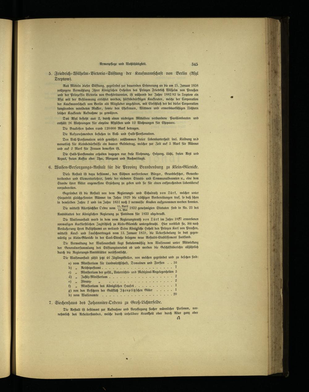 Aus Mitteln dieſer Stiftung, gegründet zur dauernden Erinnerung an die am 25. Januar 1858 vollzogene Vermählung Ihrer Königlichen Hoheiten des Prinzen Friedrich Wilhelm von Preußen und der Prinzeſſin Victoria von Großbritannien , iſt während der Jahre 1882/83 in Treptow ein Aſyl mit der Beſtimmung errichtet worden, hülfsbedürftigen Kaufleuten, welche der Corporation der Kaufmannſchaft von Berlin als Mitglieder angehören, mit Einſchluß der bei dieſer Corporation fungirenden vereideten Makler, ſowie den Ehefrauen, Wittwen und erwerbsunfähigen Töchtern ſolcher Kaufleute Aufnahme zu gewähren.