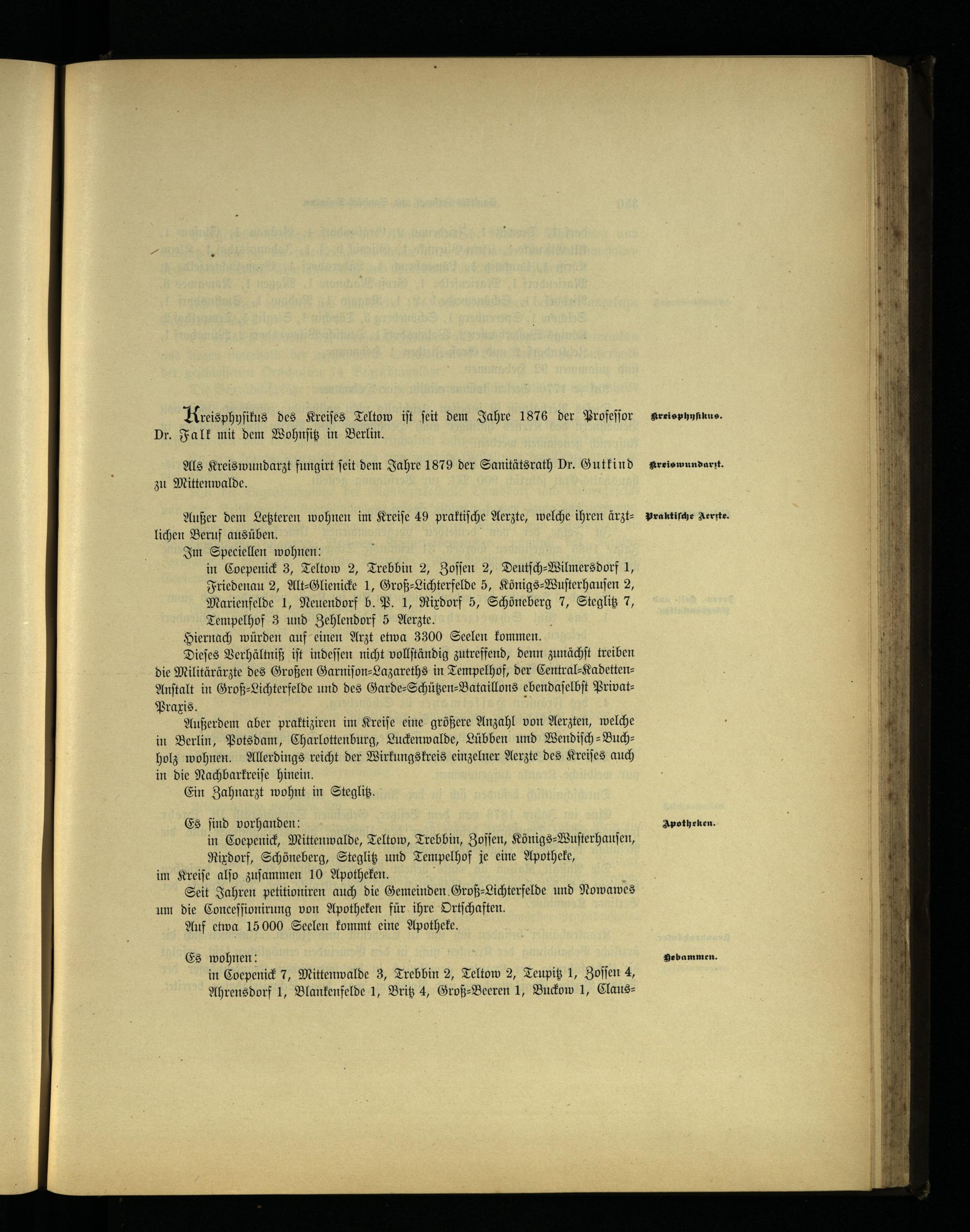 Außerdem aber praktiziren im Kreiſe eine größere Anzahl von Aerzten, welche in Berlin , Potsdam , Charlottenburg , Luckenwalde , Lübben und Wendiſch-Buch— holz wohnen. Allerdings reicht der Wirkungskreis einzelner Aerzte des Kreiſes auch in die Nachbarkreiſe hinein.