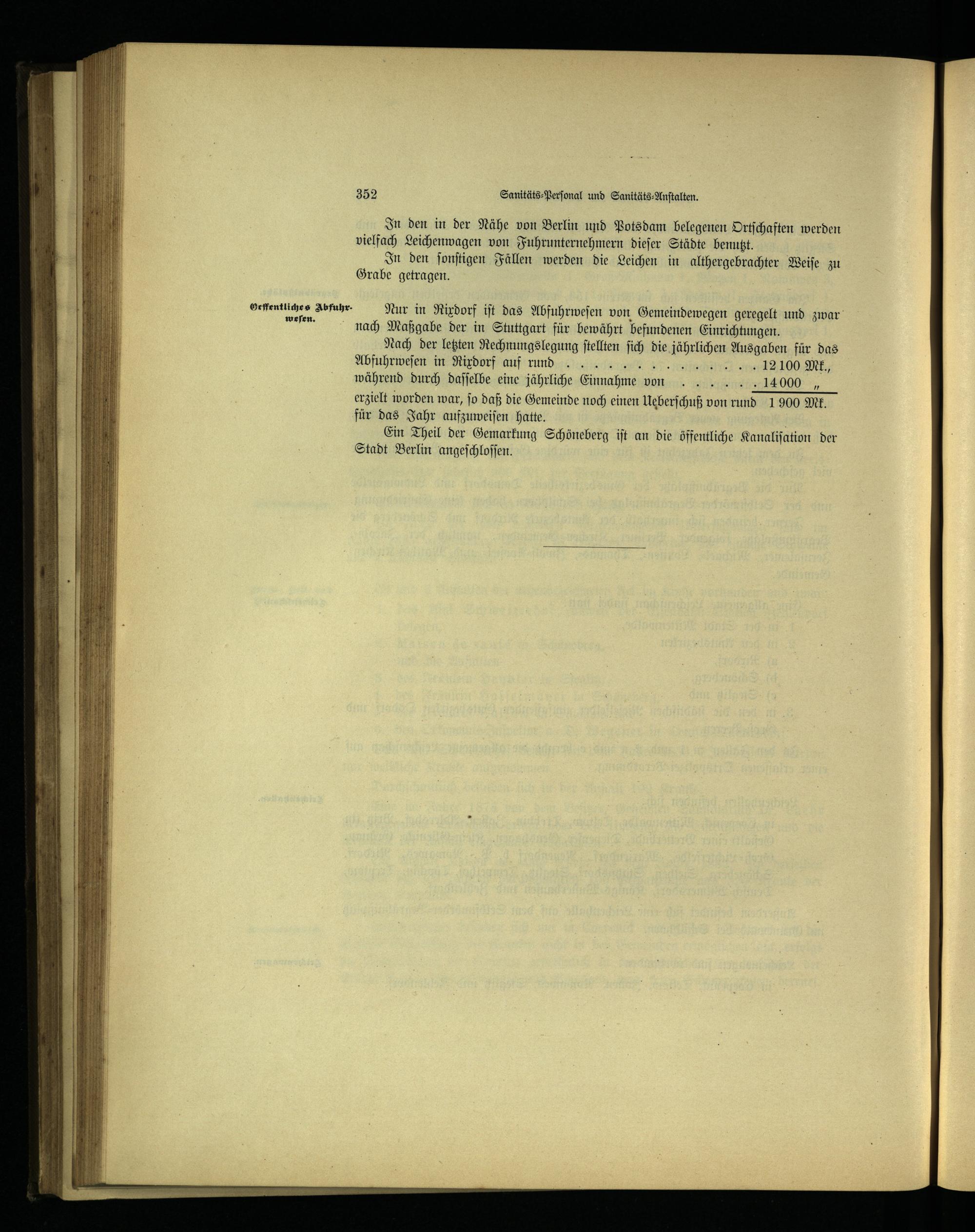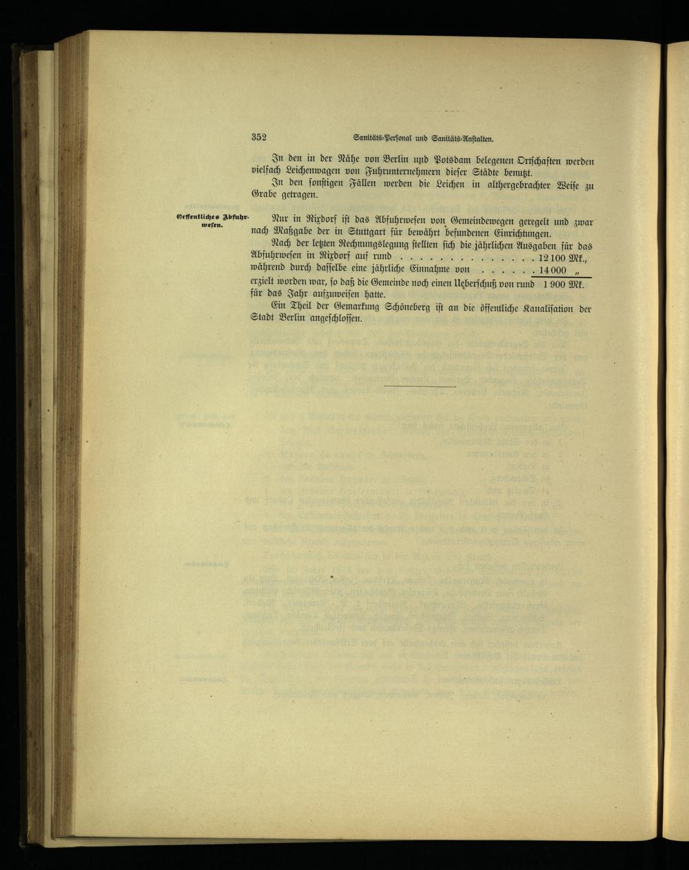 Nach der letzten Rechnungslegung ſtellten ſich die jährlichen Ausgaben für das Abfuhrweſen in Rixdorf auf rund n 00 ME, während durch daſſelbe eine jährliche Einnahme von 14000, erzielt worden war, ſo daß die Gemeinde noch einen Ueberſchuß von rund 1900 Mk. für das Jahr aufzuweiſen hatte.;