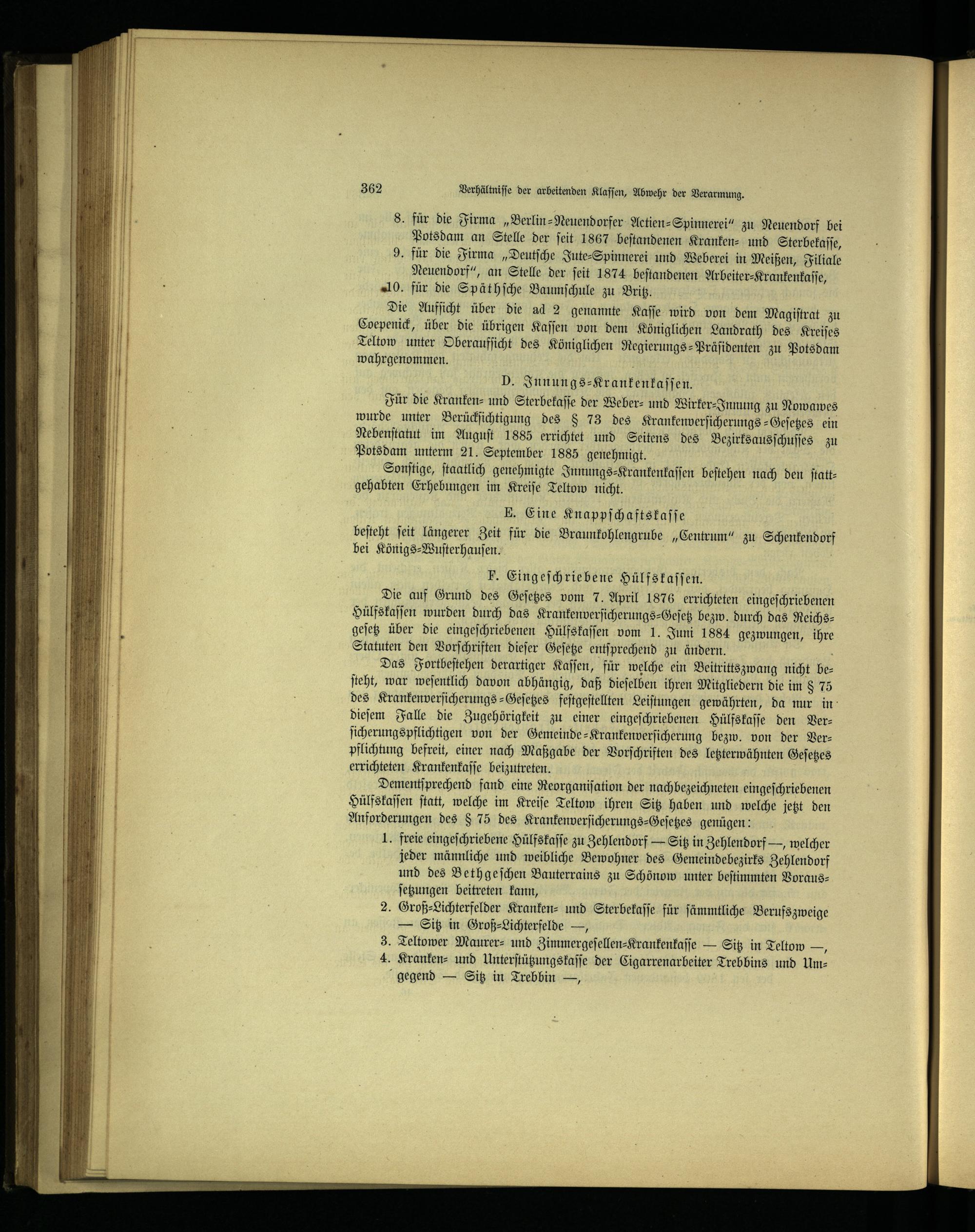 Für die Kranken⸗ und Sterbekaſſe der Weber- und Wirker⸗Innung zu Nowawes wurde unter Berückſichtigung des§z 73 des Krankenverſicherungs-Geſetzes ein Nebenſtatut im Auguſt 1885 errichtet und Seitens des Bezirks ausſchuſſes zu Potsdam unterm 21. September 1885 genehmigt.