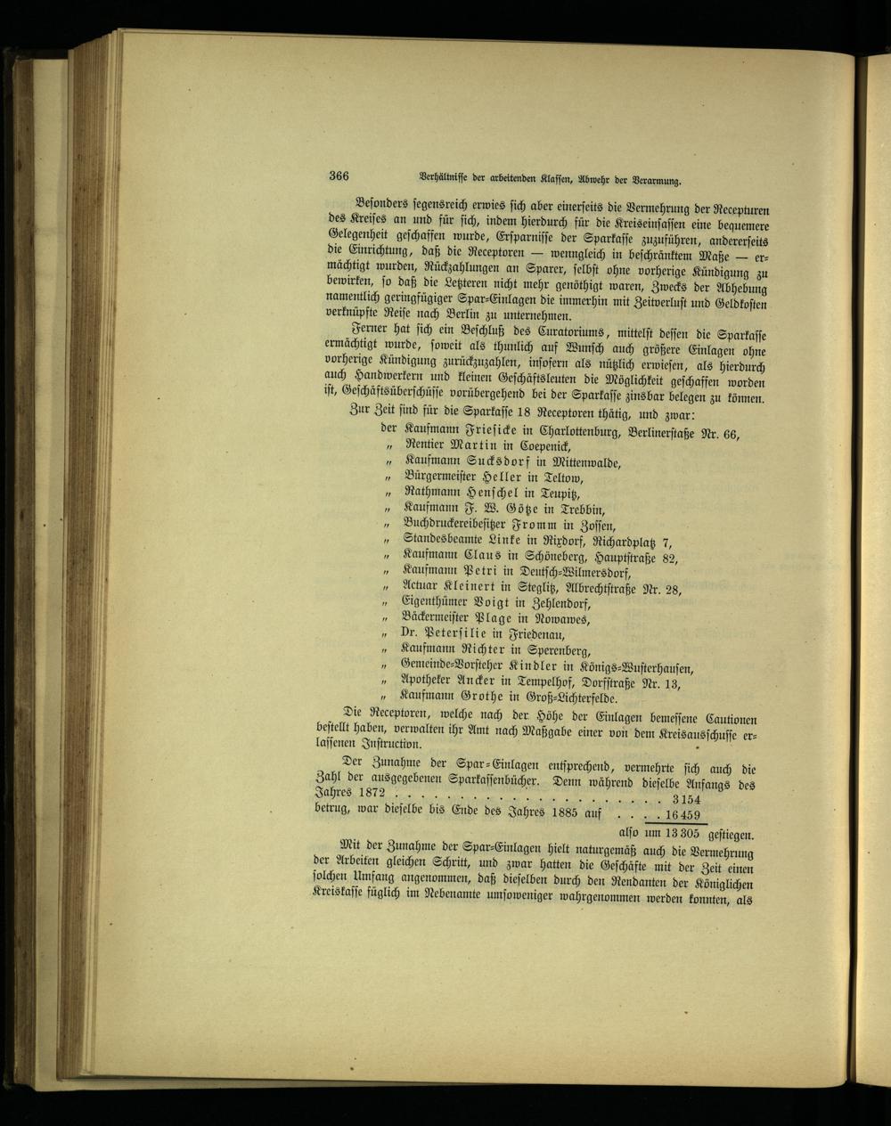 Beſonders ſegensreich erwies ſich aber einerſeits die Vermehrung der Recepturen des Kreiſes an und für ſich, indem hierdurch für die Kreiseinſaſſen eine bequemere Gelegenheit geſchaffen wurde, Erſparniſſe der Sparkaſſe zuzuführen, andererſeits die Einrichtung, daß die Receptoren— wenngleich in beſchränktem Maße— er— mächtigt wurden, Rückzahlungen an Sparer, ſelbſt ohne vorherige Kündigung zu bewirken, ſo daß die Letzteren nicht mehr genöthigt waren, Zwecks der Abhebung namentlich geringfügiger Spar⸗Einlagen die immerhin mit Zeitverluſt und Geldkoſten verknüpfte Reiſe nach Berlin zu unternehmen. Ferner hat ſich ein Beſchluß des Curatoriums, mittelſt deſſen die Sparkaſſe ermächtigt wurde, ſoweit als thunlich auf Wunſch auch größere Einlagen ohne vorherige Kündigung zurückzuzahlen, inſofern als nützlich erwieſen, als hierdurch auch Handwerkern und kleinen Geſchäfts leuten die Möglichkeit geſchaffen worden iſt, Geſchäftsüberſchüſſe vorübergehend bei der Sparkaſſe zins bar belegen zu können. Zur Zeit ſind für die Sparkaſſe 18 Receptoren thätig, und zwar: der Kaufmann Frieſicke in Charlottenburg , Berlinerſtaße Nr. 66, „Rentier Martin in Coepenick, „Kaufmann Sucks dorf in Mittenwalde , „Bürgermeiſter Heller in Teltow, „ Rathmann Henſchel in Teupitz , „Kaufmann F. W. Götze in Trebbin , „Buchdruckereibeſitzer Fromm in Zoſſen , „Standesbeamte Linke in Rixdorf, Richardplatz 7, „Kaufmann Claus in Schöneberg , Hauptſtraße 82, „Kaufmann Petri in Deutſch⸗Wilmersdorf, „Aectuar Kleinert in Steglitz , Albrechtſtraße Nr. 28, „Eigenthümer Voigt in Zehlendorf , „Bäckermeiſter Plage in Nowawes , „Dr. Peterſilie in Friedenau , „Kaufmann Richter in Sperenberg , „Gemeinde⸗Vorſteher Kindler in Königs⸗Wuſterhauſen , „Apotheker Ancker in Tempelhof , Dorfſtraße Nr. 13, „Kaufmann Grothe in Groß⸗Lichterfelde .