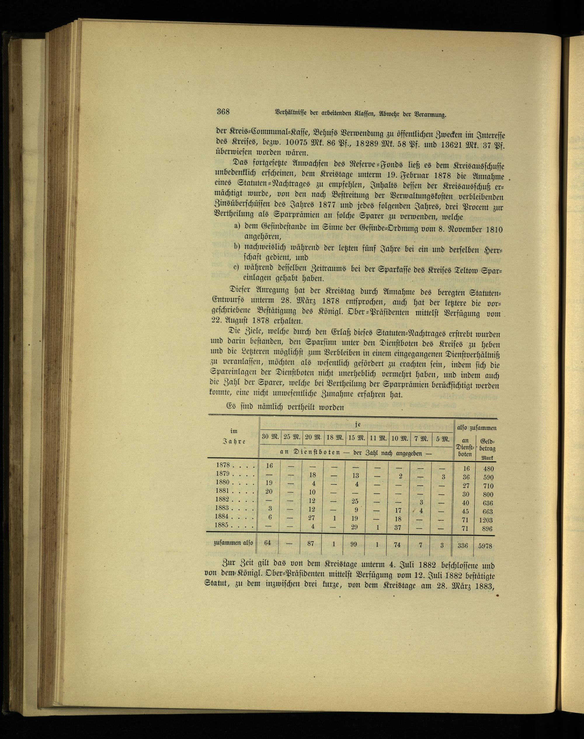 Die Ziele, welche durch den Erlaß dieſes Statuten⸗Nachtrages erſtrebt wurden und darin beſtanden, den Sparſinn unter den Dienſtboten des Kreiſes zu heben und die Letzteren möglichſt zum Verbleiben in einem eingegangenen Dienſtverhältniß zu veranlaſſen, möchten als weſentlich gefördert zu erachten ſein, indem ſich die Spareinlagen der Dienſtboten nicht unerheblich vermehrt haben, und indem auch die Zahl der Sparer, welche bei Vertheilung der Sparprämien berückſichtigt werden konnte, eine nicht unweſentliche Zunahme erfahren hat.