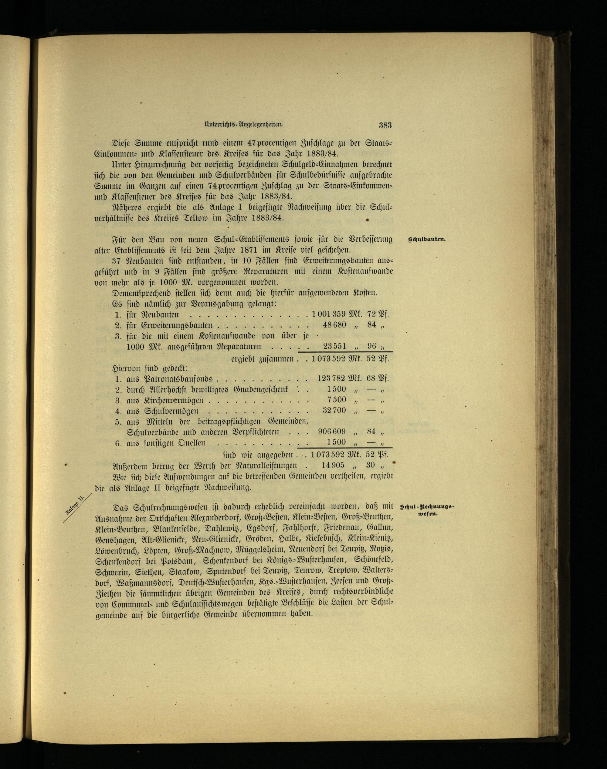 Näheres ergiebt die als Anlage I beigefügte Nachweiſung über die Schulverhältniſſe des Kreiſes Teltow im Jahre 1883,84..