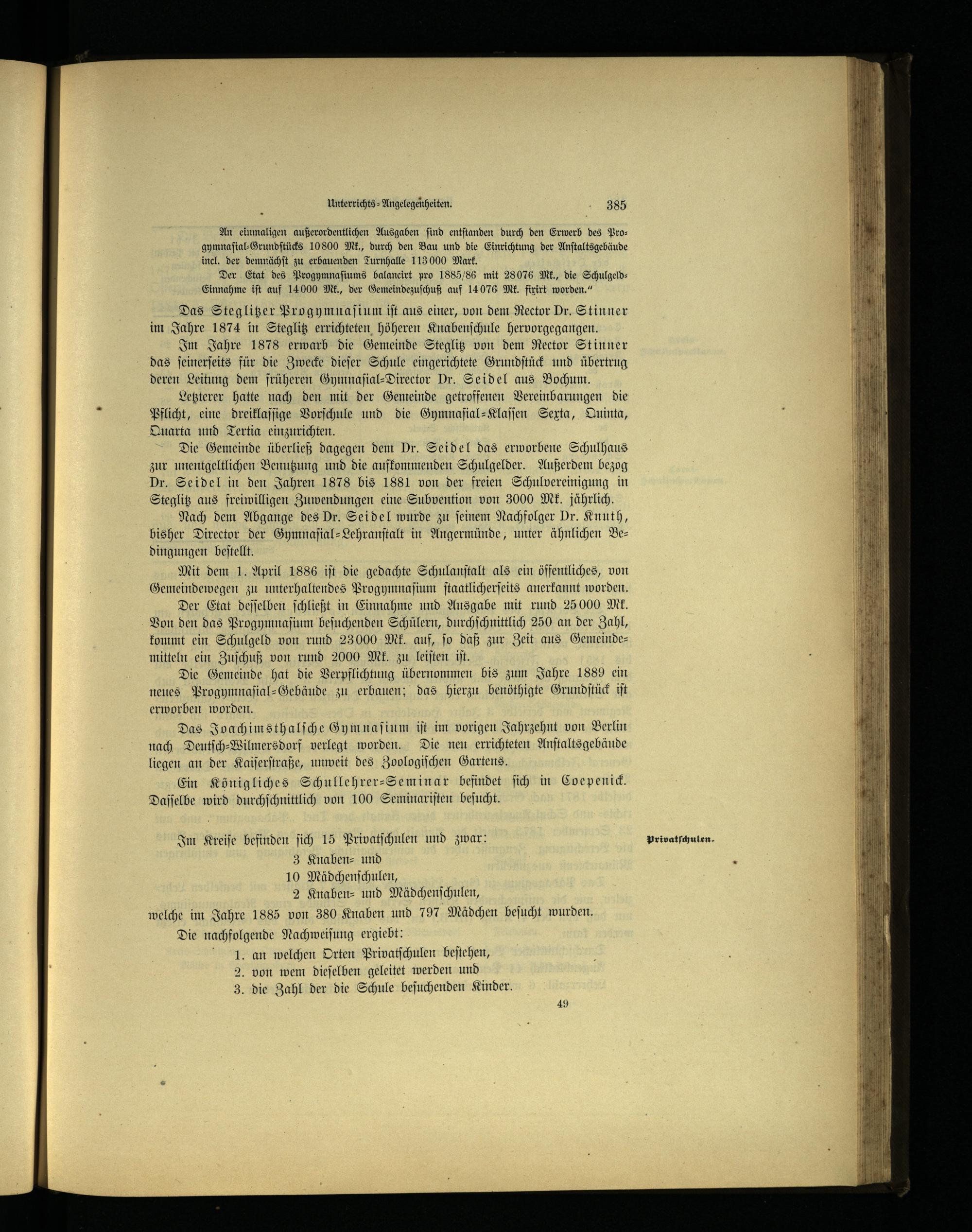 Im Jahre 1878 erwarb die Gemeinde Steglitz von dem Rector Stinner das ſeinerſeits für die Zwecke dieſer Schule eingerichtete Grundſtück und übertrug deren Leitung dem früheren Gymnaſial-Director Dr. Seidel aus Bochum .