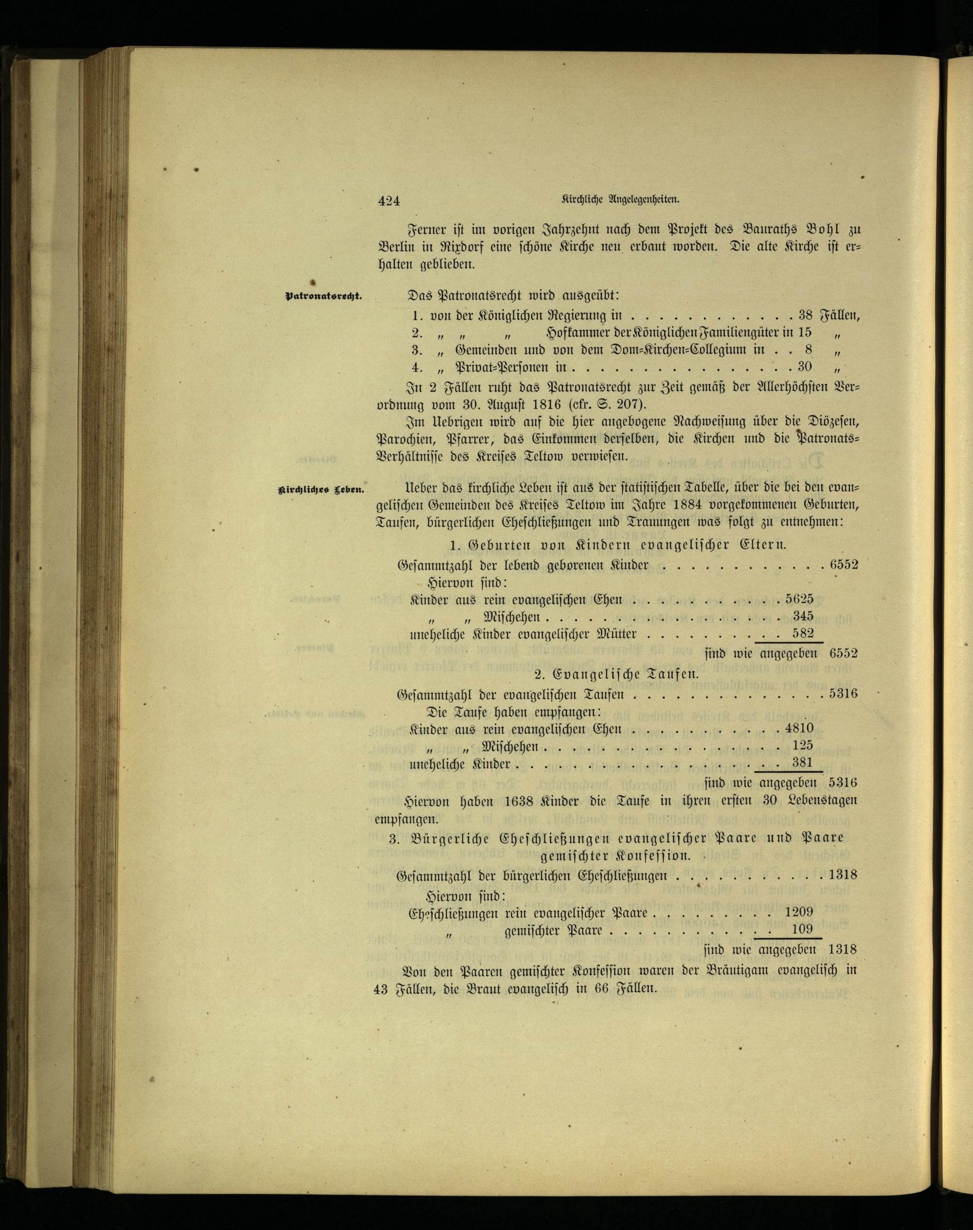 Kirchliches geben. Ueber das kirchliche Leben iſt aus der ſtatiſtiſchen Tabelle, über die bei den evangeliſchen Gemeinden des Kreiſes Teltow im Jahre 1884 vorgekommenen Geburten, Taufen, bürgerlichen Eheſchließungen und Trauungen was folgt zu entnehmen: 1. Geburten von Kindern evangeliſcher Eltern. Geſammtzahl der lebend geborenen Kinder Hiervon ſind: Kinder aus rein evangeliſchen Ehen .„Müdehen...., I 66464 , Kinder evangeliſcher Mütter J 582 ſind wie angegeber 22. Evangeliſche Taufen. Geſammtzahl der evangeliſchen Taufen. Die Taufe haben empfangen: Kinder gus rein enangeliſchen Eheen 6669 i Wich ehen ya Tel mr 128 uneheliche Kinder w ſind wie angegeben 5316 Hiervon haben 1638 Kinder die Taufe in ihren erſten 30 Lebenstagen empfangen. 3. Bürgerliche Eheſchließungen evangeliſcher Paare und Paare gemiſchter Konfeſſion. Geſammtzahl der bürgerlichen Eheſchließungen. kJ 1318 Hiervon ſind: Eheſchließungen rein evangeliſcher Paare. , gemiſchter Paare.