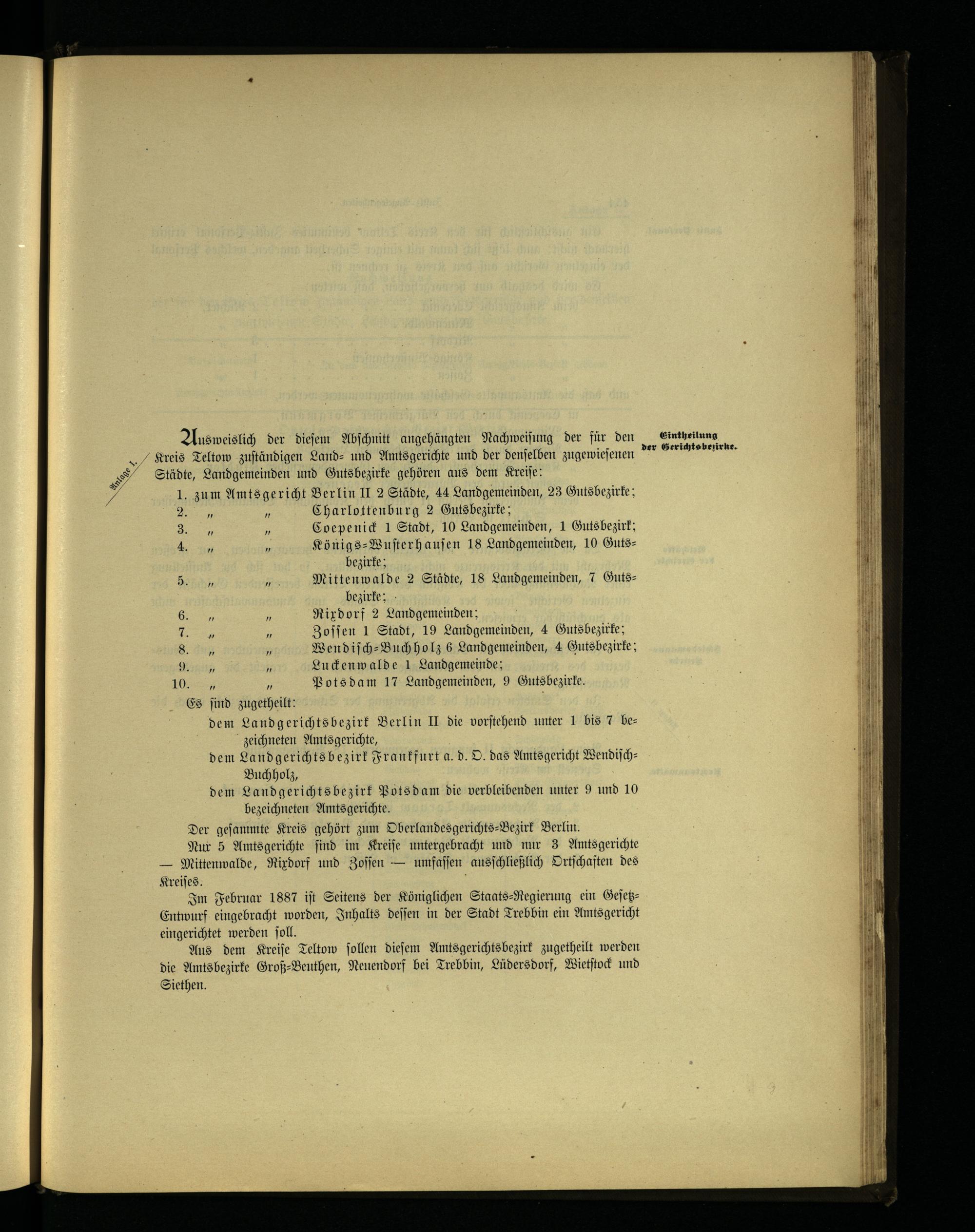 Aus weislich der dieſem Abſchnitt angehängten Nachweiſung der für den Sintheilung Kreis Teltow zuſtändigen Land- und Amtsgerichte und der denſelben zugewieſenen. N Städte, Landgemeinden und Gutsbezirke gehören aus dem Kreiſe: 1. zum Amtsgericht Berlin II 2 Städte, 44 Landgemeinden, 23 Gutsbezirke; 2. Charlottenburg 2 Gutsbezirke; 3 Coepenick 1 Stadt, 10 Landgemeinden, 1 Gutsbezirk; 4. Königs-Wuſterhauſen 18 Landgemeinden, 10 Guts— bezirke; Mittenwalde 2 Städte, 18 Landgemeinden, 7 Guts— bezirke; Rixdorf 2 Landgemeinden; Zoſſen 1 Stadt, 19 Landgemeinden, 4 Gutsbezirke; Wendiſch-Buchholz 6 Landgemeinden, 4 Gutsbezirke; Luckenwalde 1 Landgemeinde; Pots dam 17 Landgemeinden, 9 Gutsbezirke.