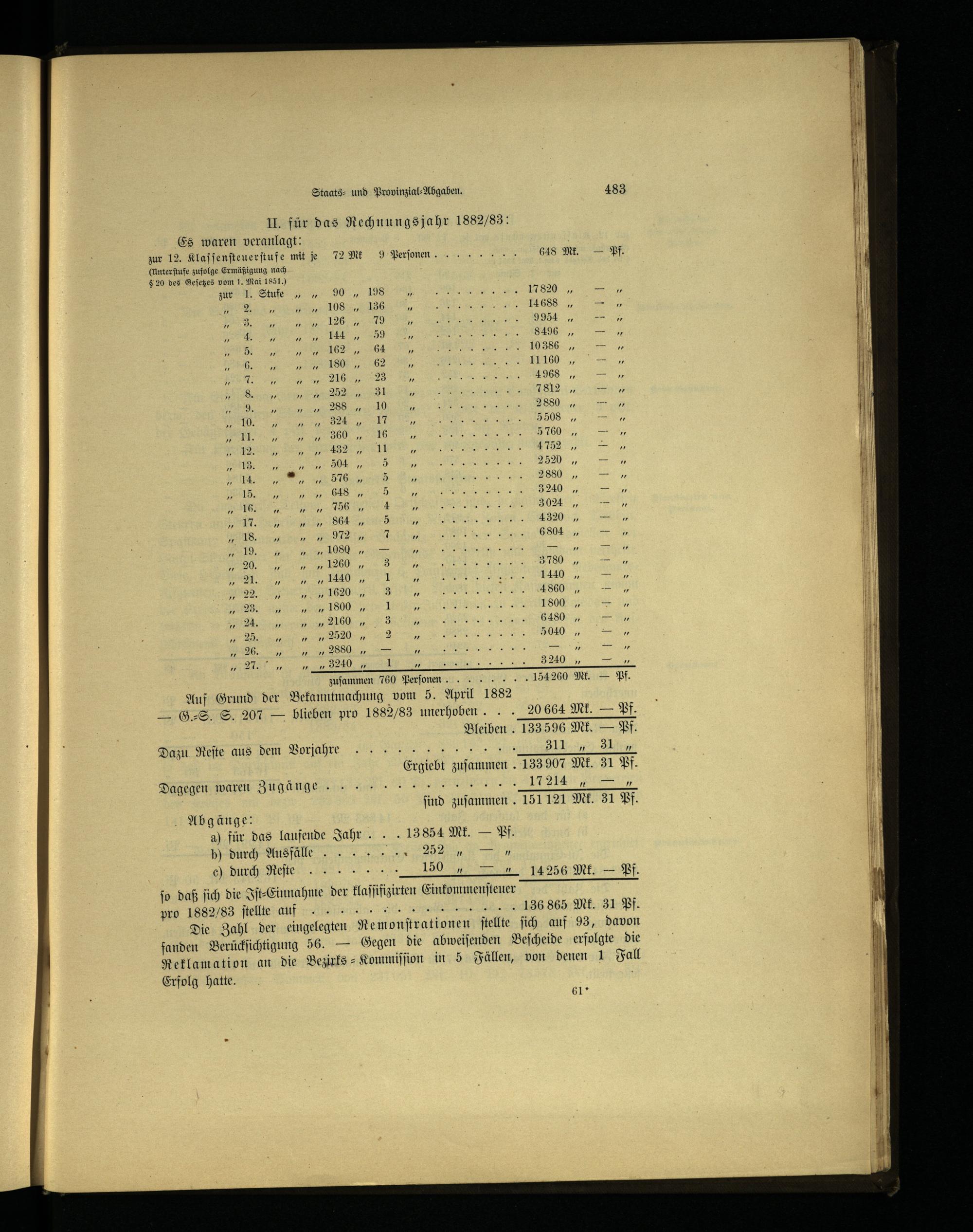 II. für das Rechnungsjahr 1882,83: Es waren veranlagt: zur 12. Klaſſenſteuerſtufe mit je 72Mt 9 Ferſenen; 648 Mk. (unterſtufe zufolge Ermäßigung nach S 20 des Geſetzes vom 1. Mai 1851.) zur 1. Stufe; 198 J 2 136 146388 € 79 779514 8496 10386 11160 4968 7812 2880 5508 5760 4752 2520 2880 3240 3024 4320 6804 3780 1440 4860 1800 6480 5040 3240 154260 Mi.— Pf.