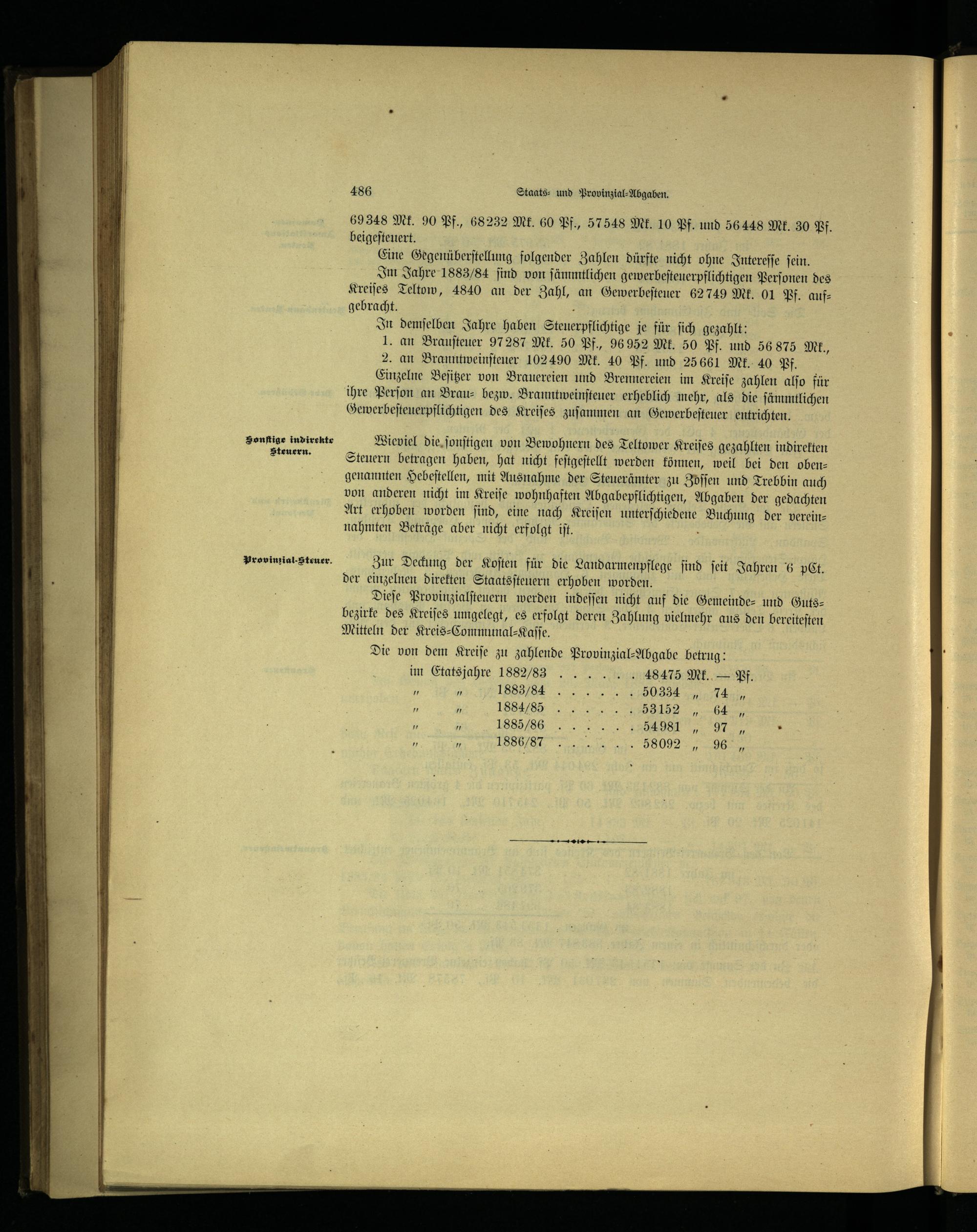 Wieviel die ſonſtigen von Bewohnern des Teltower Kreiſes gezahlten indirekten Steuern betragen haben, hat nicht feſtgeſtellt werden können, weil bei den oben— genannten Hebeſtellen, mit Ausnahme der Steuerämter zu Zoſſen und Trebbin auch von anderen nicht im Kreiſe wohnhaften Abgabepflichtigen, Abgaben der gedachten Art erhoben worden ſind, eine nach Kreiſen unterſchiedene Buchung der verein— nahmten Beträge aber nicht erfolgt iſt.+