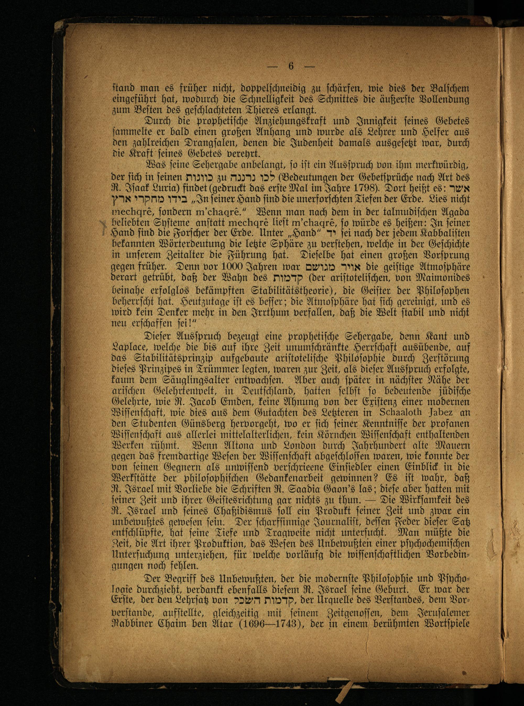 Dieser Ausspruch bezeugt eine prophetische Sehergabe, denn Kant und Laplace, welche die bis auf ihre Zeit unumschränkte Herrschaft ausübende, auf das Stabilitätsprinzip aufgebaute aristotelische Philosophie durch Zerstörung dieses Prinzipes in Trümmer legten, waren zur Zeit, als dieser Ausspruch erfolgte, kaum dem Säuglingsalter entwachsen. Aber auch später in nächster Nähe der arischen Gelehrtenwelt, in Deutschland, hatten selbst so bedeutende jüdische Gelehrte, wie R. Jacob Emden, keine Ahnung von der Existenz einer modernen Wissenschaft, wie dies aus dem Gutachten des Letzteren in Schaaloth Jabez an den Studenten Günsberg hervorgeht, wo er sich seiner Kenntnisse der profanen Wissenschaft aus allerlei mittelalterlichen, kein Körnchen Wissenschaft enthaltenden Werken rühmt. Wenn Altona und London durch Jahrhundert alte Mauern gegen das fremdartige Wesen der Wissenschaft abgeschlossen waren, wie konnte der von seinen Gegnern als unwissend verschrieene Einsiedler einen Einblick in die Werkstätte der philosophischen Gedankenarbeit gewinnen? Es ist wahr, daß R. Israel mit Vorliebe die Schriften R. Saadia Gaon's las; diese aber hatten mit seiner Zeit und ihrer Geistesrichtung gar nichts zu thun. — Die Wirksamkeit des R. Israel und seines Chaßidismus soll ein Produkt seiner Zeit und zwar ein unbewußtes gewesen sein. Der scharfsinnige Journalist, dessen Feder dieser Satz entschlüpfte, hat seine Tiefe und Tragweite nicht untersucht. Man müßte die Zeit, die Art ihrer Produktion, das Wesen des Unbewußten einer psychochemischen Untersuchung unterziehen, für welche vorläufig die wissenschaftlichen Vorbedingungen noch fehlen.