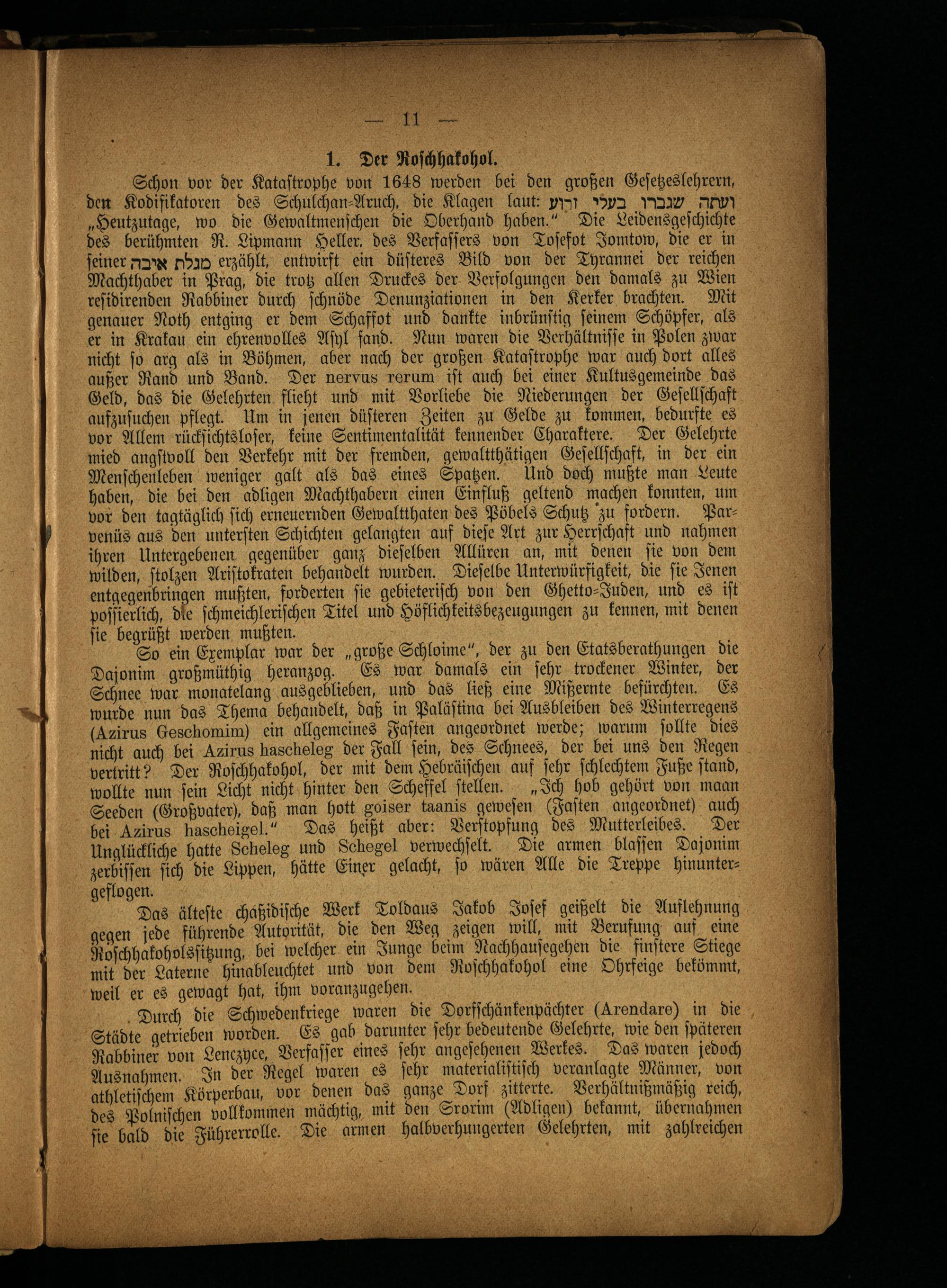 Durch die Schwedenkriege waren die Dorfschänkenpächter (Arendare) in die Städte getrieben worden. Es gab darunter sehr bedeutende Gelehrte, wie den späteren Rabbiner von Lenczyce, Verfasser eines sehr angesehenen Werkes. Das waren jedoch Ausnahmen. In der Regel waren es sehr materialistisch veranlagte Männer, von athletischem Körperbau, vor denen das ganze Dorf zitterte. Verhältnißmäßig reich, des Polnischen vollkommen mächtig, mit den Srorim (Adligen) bekannt, übernahmen sie bald die Führerrolle. Die armen halbverhungerten Gelehrten, mit zahlreichen