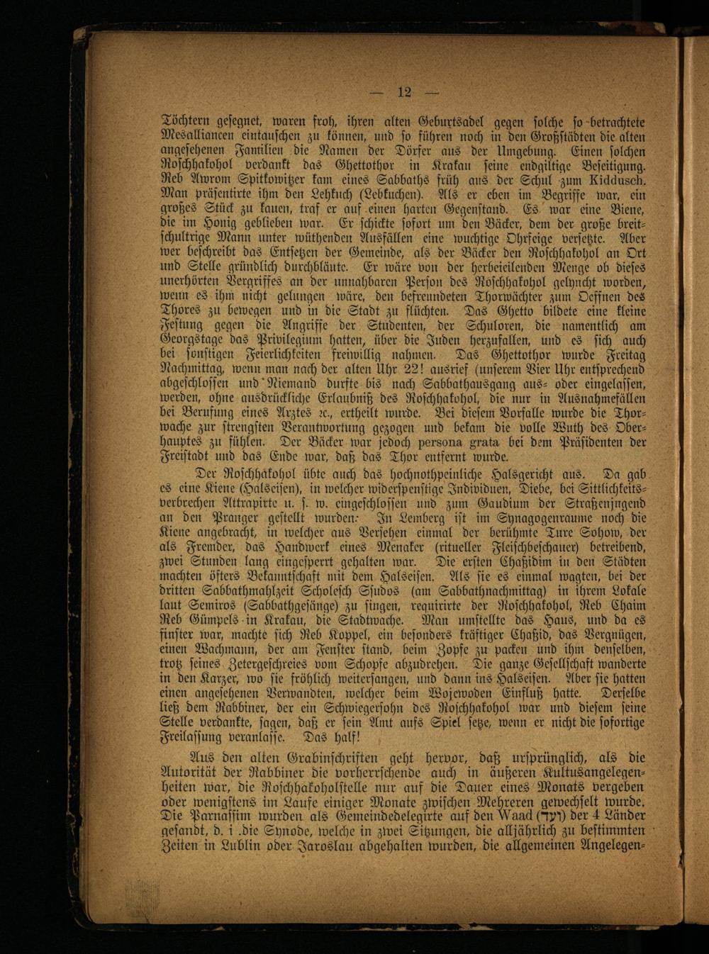 Töchtern gesegnet, waren froh, ihren alten Geburtsadel gegen solche so betrachtete Mesalliancen eintauschen zu können, und so führen noch in den Großstädten die alten angesehenen Familien die Namen der Dörfer aus der Umgebung. Einen solchen Roschhakohol verdankt das Ghettothor in Krakau seine endgiltige Beseitigung. Reb Awrom Spitkowitzer kam eines Sabbaths früh aus der Schul zum Kiddusch. Man präsentirte ihm den Lehkuch (Lebkuchen). Als er eben im Begriffe war, ein großes Stück zu kauen, traf er auf einen harten Gegenstand. Es war eine Biene, die im Honig geblieben war. Er schickte sofort um den Bäcker, dem der große breitschultrige Mann unter wüthenden Ausfällen eine wuchtige Ohrfeige versetzte. Aber wer beschreibt das Entsetzen der Gemeinde, als der Bäcker den Roschhakohol an Ort und Stelle gründlich durchbläute. Er wäre von der herbeieilenden Menge ob dieses unerhörten Vergriffes an der unnahbaren Person des Roschhakohol gelyncht worden, wenn es ihm nicht gelungen wäre, den befreundeten Thorwächter zum Oeffnen des Thores zu bewegen und in die Stadt zu flüchten. Das Ghetto bildete eine kleine Festung gegen die Angriffe der Studenten, der Schuloren, die namentlich am Georgstage das Privilegium hatten, über die Juden herzufallen, und es sich auch bei sonstigen Feierlichkeiten freiwillig nahmen. Das Ghettothor wurde Freitag Nachmittag, wenn man nach der alten Uhr 22! ausrief (unserem Vier Uhr entsprechend abgeschlossen und Niemand durfte bis nach Sabbathausgang aus- oder eingelassen, werden, ohne ausdrückliche Erlaubniß des Roschhakohol, die nur in Ausnahmefällen bei Berufung eines Arztes etc., ertheilt wurde. Bei diesem Vorfälle wurde die Thorwache zur strengsten Verantwortung gezogen und bekam die volle Wuth des Oberhauptes zu fühlen. Der Bäcker war jedoch persona grata bei dem Präsidenten der Freistadt und das Ende war, daß das Thor entfernt wurde.