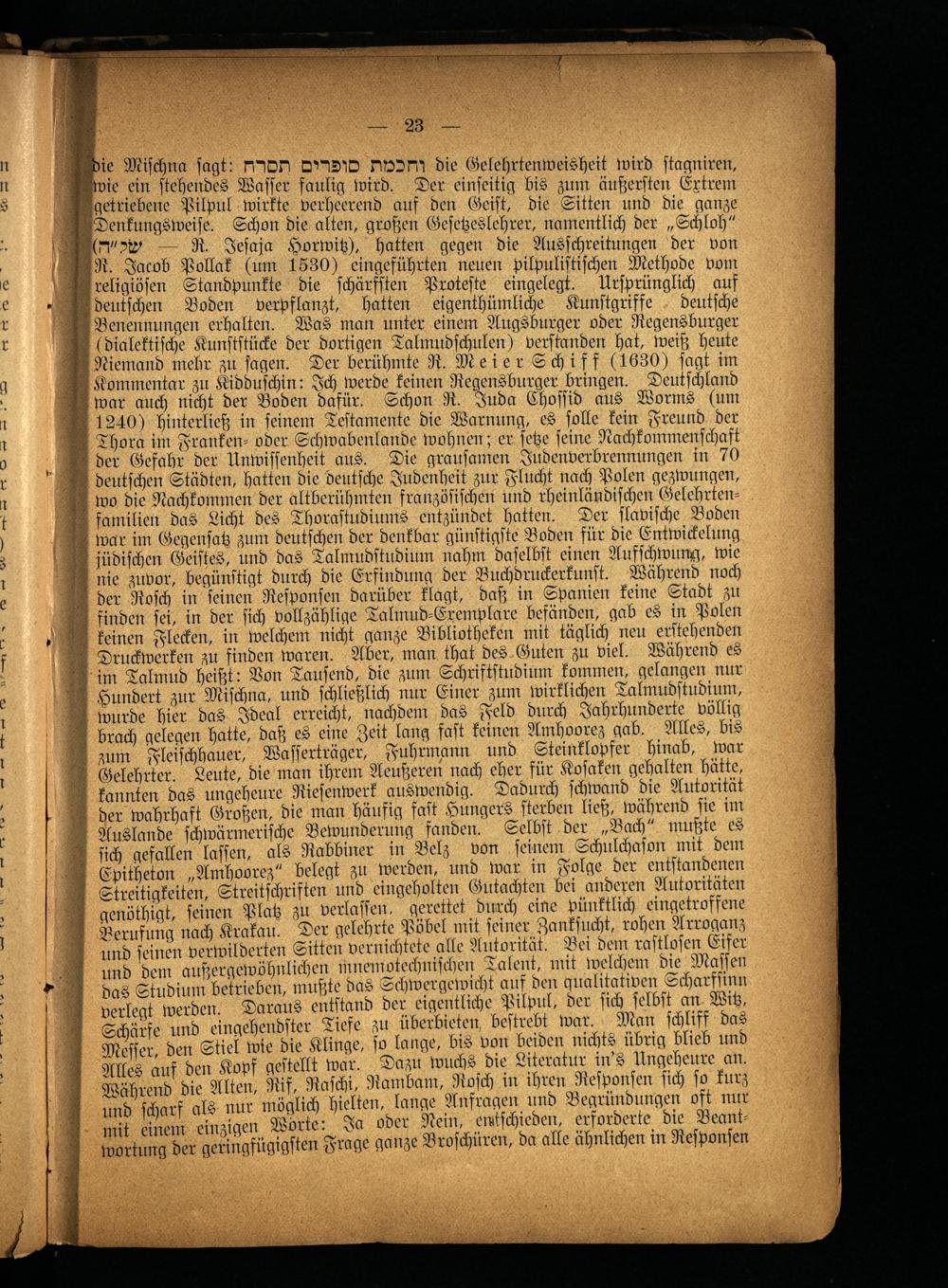 wie ein stehendes Wasser faulig wird. Der einseitig bis zum äußersten Extrem getriebene Pilpul wirkte verheerend auf den Geist, die Sitten und die ganze Denkungsweise. Schon die alten, großen Gesetzeslehrer, namentlich der „Schloh" — R. Jesaja Horwitz), hatten gegen die Ausschreitungen der von R. Jacob Pollak (um 1630) eingeführten neuen pilpulistischen Methode vom religiösen Standpunkte die schärfsten Proteste eingelegt. Ursprünglich auf deutschen Boden verpflanzt, hatten eigenthümliche Kunstgriffe deutsche Benennungen erhalten. Was man unter einem Augsburger oder Regensburger (dialektische Kunststücke der dortigen Talmudschulen) verstanden hat, weiß heute Niemand mehr zu sagen. Der berühmte R. Me ier S c hiff ( 1630) sagt im Kommentar zu Kidduschin: Ich werde keinen Regensburger bringen. Deutschland war auch nicht der Boden dafür. Schon R. Juda Chossid aus Worms (um 1240) hinterließ in seinem Testamente die Warnung, es solle kein Freund der Thora im Franken- oder Schwabenlande wohnen; er setze seine Nachkommenschaft der Gefahr der Unwissenheit aus. Die grausamen Jndenverbrennungen in 70 deutschen Städten, hatten die deutsche Judenheit zur Flucht nach Polen gezwungen, wo die Nachkommen der altberühmten französischen und rheinländischen Gelehrtenfamilien das Licht des Thorastudiums entzündet hatten. Der slavische Boden war im Gegensatz zum deutschen der denkbar günstigste Boden für die Entwickelung jüdischen Geistes, und das Talmudstudium nahm daselbst einen Aufschwung, wie nie zuvor, begünstigt durch die Erfindung der Buchdruckerkunst. Während noch der Rosch in seinen Responsen darüber klagt, daß in Spanien keine Stadt zu finden sei, in der sich vollzählige Talmud-Exemplare befänden, gab es in Polen keinen Flecken, in welchem nicht ganze Bibliotheken mit täglich neu erstehenden Druckwerken zu finden waren. Aber, man that des Guten zu viel. Während es im Talmud heißt: Von Tausend, die zum Schriftstudium kommen, gelangen nur Hundert zur Mischna, und schließlich nur Einer zum wirklichen Talmudstudium, wurde hier das Ideal erreicht, nachdem das Feld durch Jahrhunderte völlig brach gelegen hatte, daß es eine Zeit lang fast keinen Amhoorez gab. Alles, bis zum Fleischhauer, Wasserträger, Fuhrmann und Steinklopfer hinab, war Gelehrter. Leute, die man ihrem Aeußeren nach eher für Kosaken gehalten hätte, kannten das ungeheure Riesenwerk auswendig. Dadurch schwand die Autorität der wahrhaft Großen, die man häufig fast Hungers sterben ließ, während sie im Auslande schwärmerische Bewunderung fanden. Selbst der „Bach" mußte es sich gefallen lassen, als Rabbiner in Belz von seinem Schulchason mit dem Epitheton „Amhoorez" belegt zu werden, und war in Folge der entstandenen Streitigkeiten, Streitschriften und eingeholten Gutachten bei anderen Autoritäten genöthigt, seinen Platz zu verlassen, gerettet durch eine pünktlich eingetroffene Berufung nach Krakau. Der gelehrte Pöbel mit seiner Zanksucht, rohen Arroganz und seinen verwilderten Sitten vernichtete alle Autorität. Bei dem rastlosen Eifer und dem außergewöhnlichen mnemotechnischen Talent, mit welchem die Massen das Studium betrieben, mußte das Schwergewicht auf den qualitativen Scharfsinn verlegt werden. Daraus entstand der eigentliche Pilpul, der sich selbst an Witz, Schärfe und eingehendster Tiefe zu überbieten bestrebt war. Man schliff das Messer, den Stiel wie die Klinge, so lange, bis von beiden nichts übrig blieb und Alles auf den Kopf gestellt war. Dazu wuchs die Literatur in's Ungeheure an. Während die Alten, Rif, Raschi, Rambam, Rosch in ihren Responsen sich so kurz und scharf als nur möglich hielten, lange Anfragen und Begründungen oft nur mit einem einzigen Worte: Ja oder Nein, entschieden, erforderte die Beantwortung der geringfügigsten Frage ganze Broschüren, da alle ähnlichen in Responsen