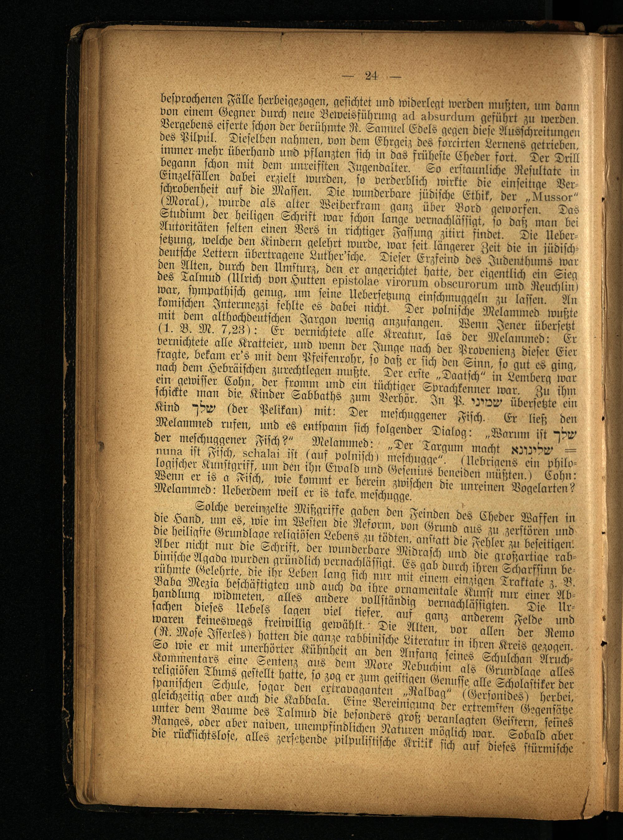 besprochenen Fälle herbeigezogen, gesichtet und widerlegt werden mußten, um dann von einem Gegner durch neue Beweisführung ad asumrdum geführt zu werden. Vergebens eiferte schon der berühmte R. Samuel Edels gegen diese Ausschreitungen des Pilpul. Dieselben nahmen, von dem Ehrgeiz des formten Lernens getrieben, immer mehr überhand und pflanzten sich in das früheste Cheder fort. Der Drill begann schon mit dem unreifsten Jugendalter. So erstaunliche Resultate in Einzelfällen dabei erzielt wurden, so verderblich wirkte die einseitige Ver- schrobenheit auf die Massen. Die wunderbare jüdische Ethik, der „Mussor" (Moral), wurde als alter Weiberkram ganz über Bord geworfen. Das